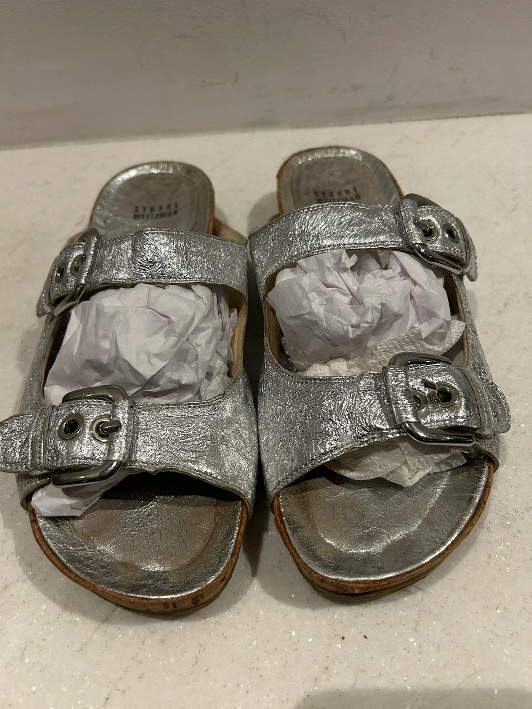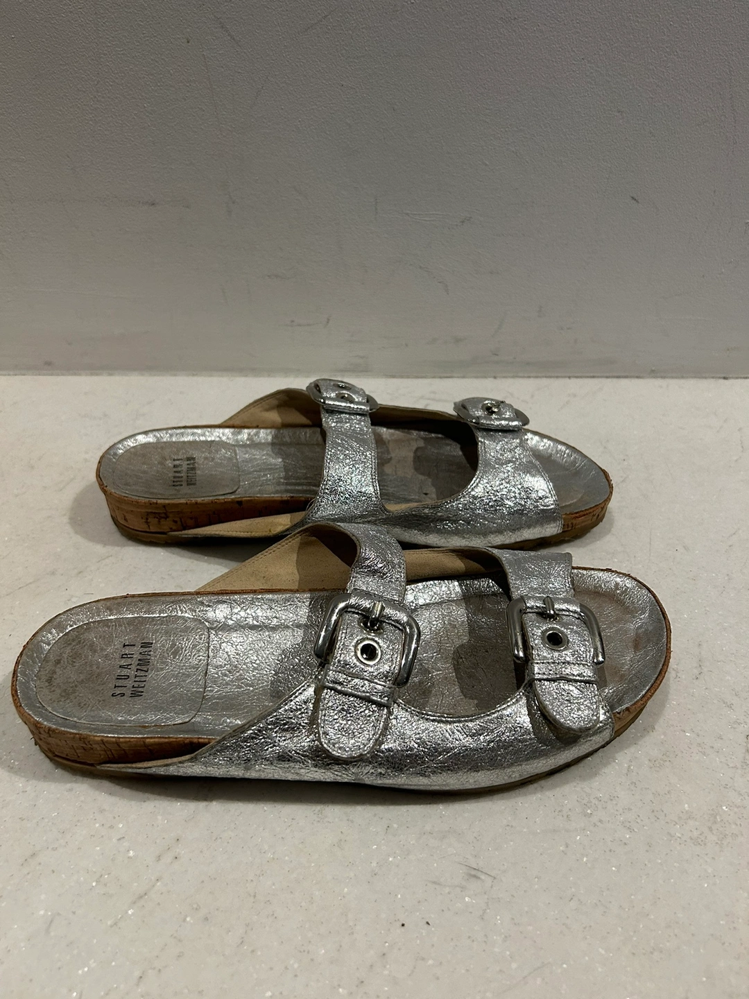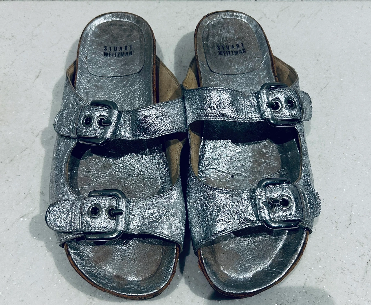 Silver leather sandals with cork soles and double buckles. The sandals are in a slip-on style. So cute silver silver leather and cork weitzman double buckle sandals. Size 8. Adjustable buckle. Gorgeous textured leather material. In very good condition. Some wear on the bottom but could be cleaned up to look new. These have such a cool upscale Birkenstock style. The colour makes them extra special. Retailed for $250