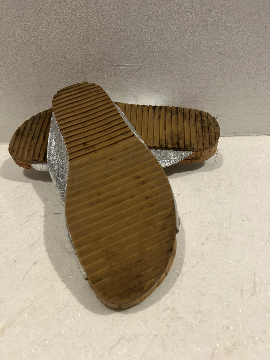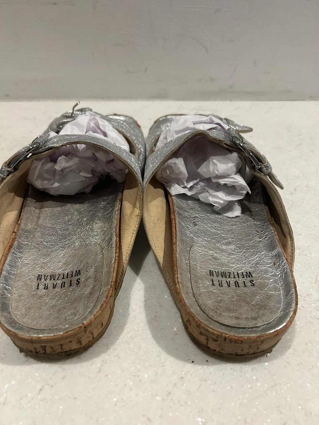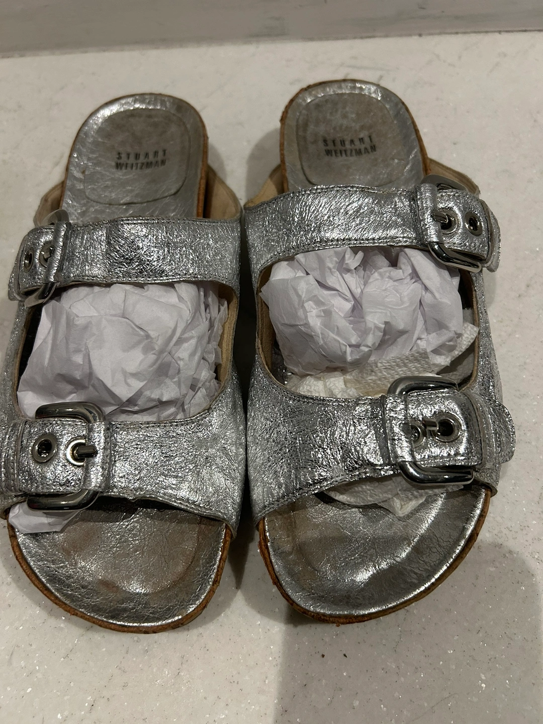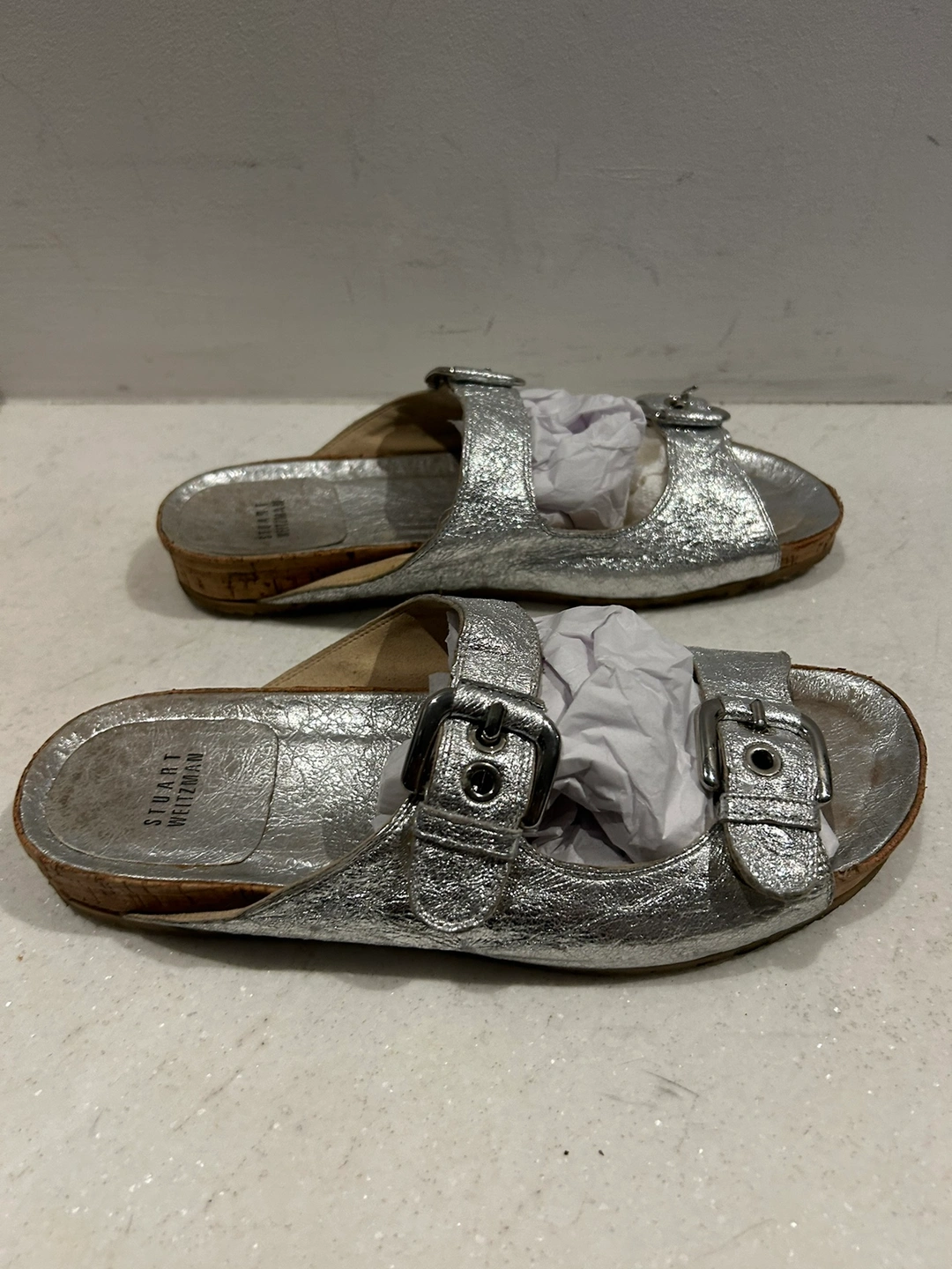 Silver leather sandals with cork soles and double buckles. The sandals are in a slip-on style. So cute silver silver leather and cork weitzman double buckle sandals. Size 8. Adjustable buckle. Gorgeous textured leather material. In very good condition. Some wear on the bottom but could be cleaned up to look new. These have such a cool upscale Birkenstock style. The colour makes them extra special. Retailed for $250