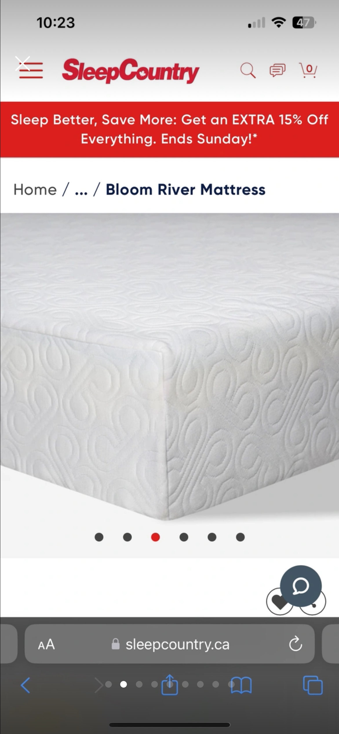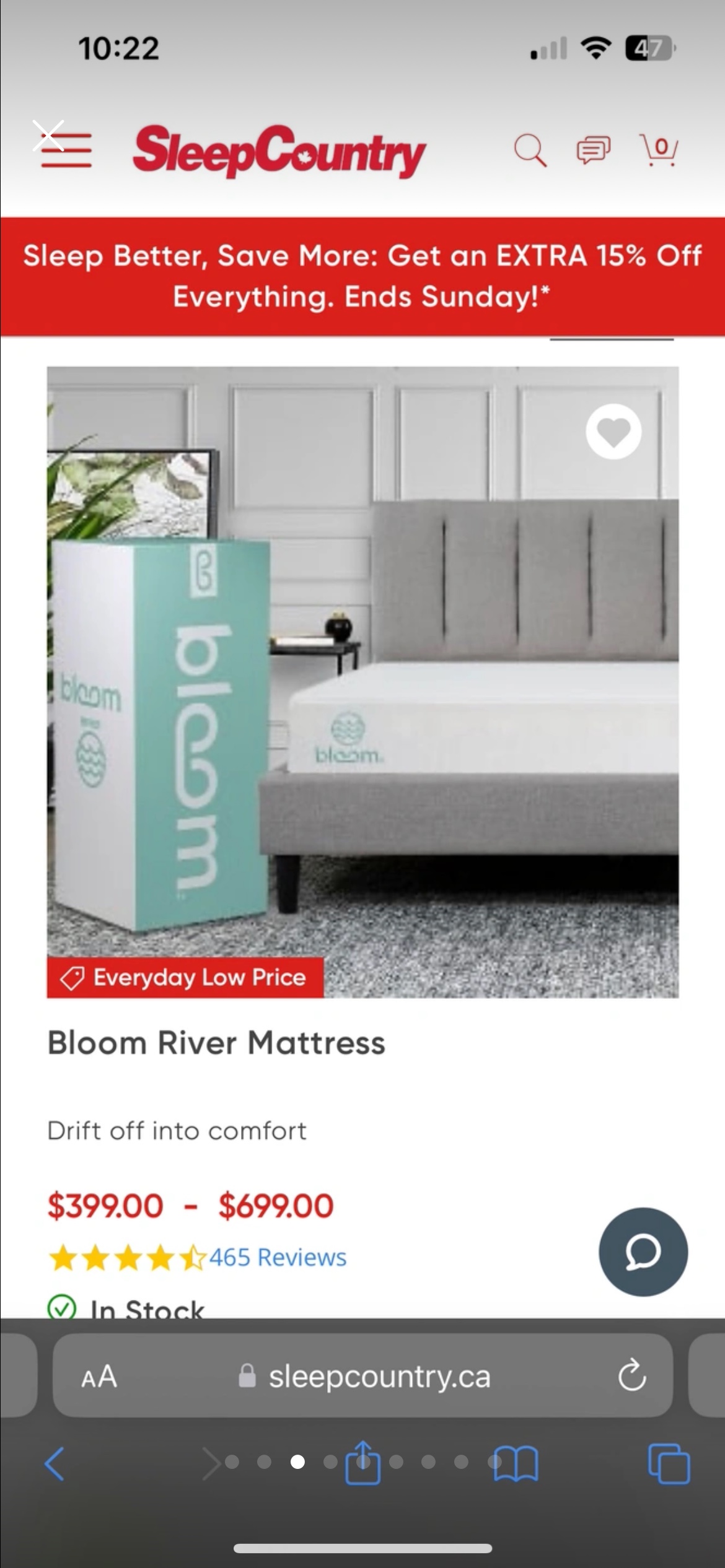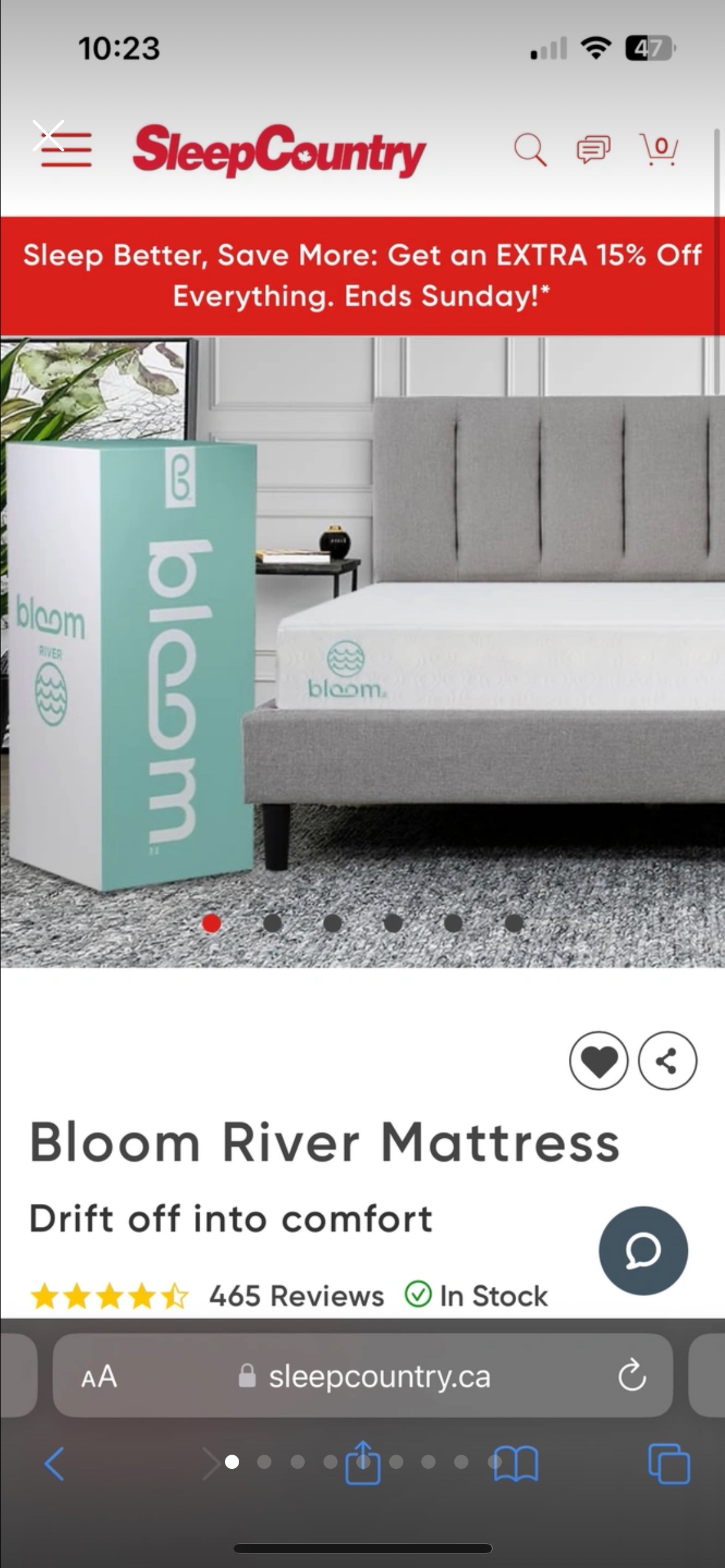 1 / 61 / 6Buy & SellBloom River Mattress from Sleep Country - Double/FullBloom River Mattress from Sleep Country - Double/Full$117Mattress is in excellent condition. Bought in 2021 from Sleep Country. Very softWHERE TO MEETIonviewView MapSELLERMelIonview17818 reviews4 chats·1 favorites·99 viewsSEND CHAT TO SELLERHi Mel! I’m interested in your listing.Hi Mel! I’m interested in your listing.Get the Karrot app to chatSign In to chat