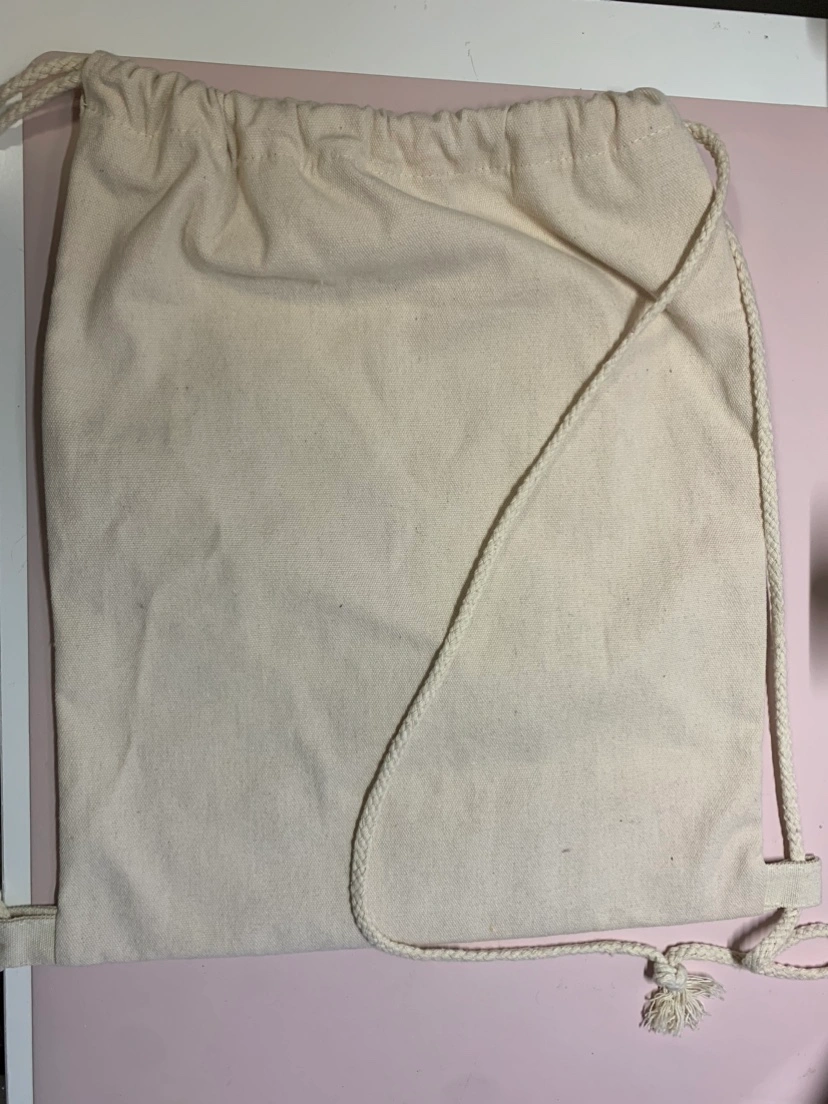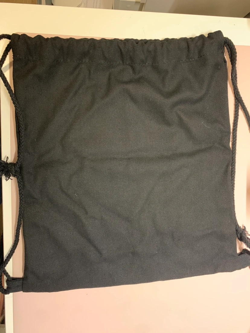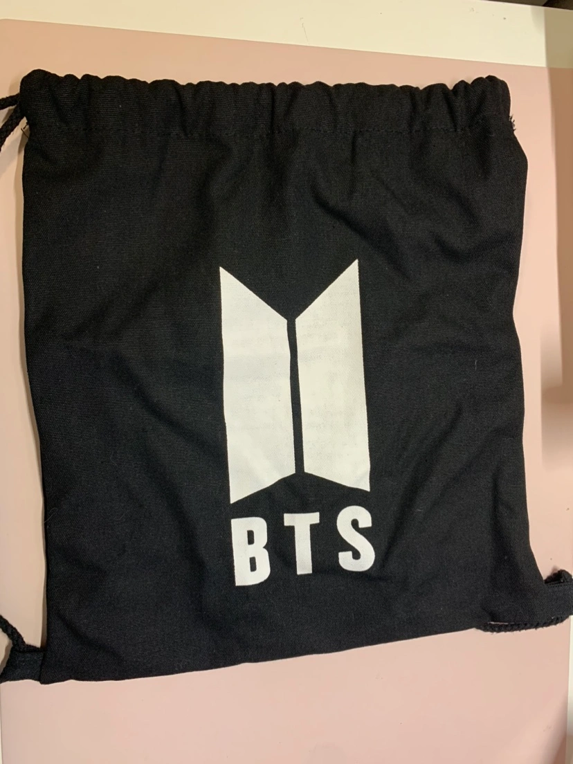 A black and white drawstring bag with the BTS logo. It can be worn as a backpack or a shoulder bag.