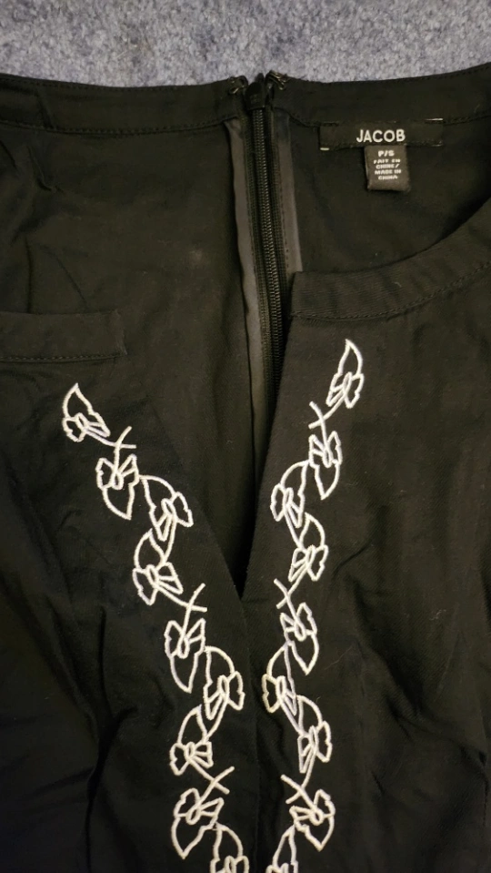 A black sleeveless pleated dress with white embroidered bows and a white trim. The dress has a zipper up the back.