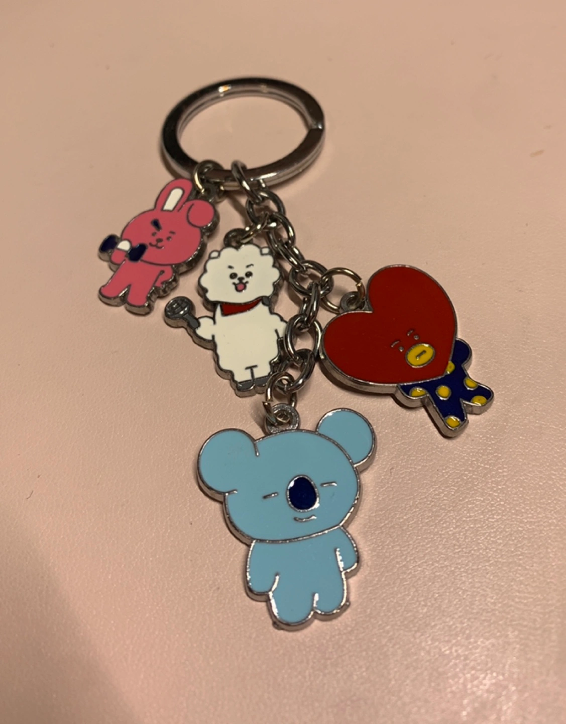 This keychain has four charms. They are Koya, RJ, Cooky and Chimmy. They are attached to a silver chain with a metal ring.