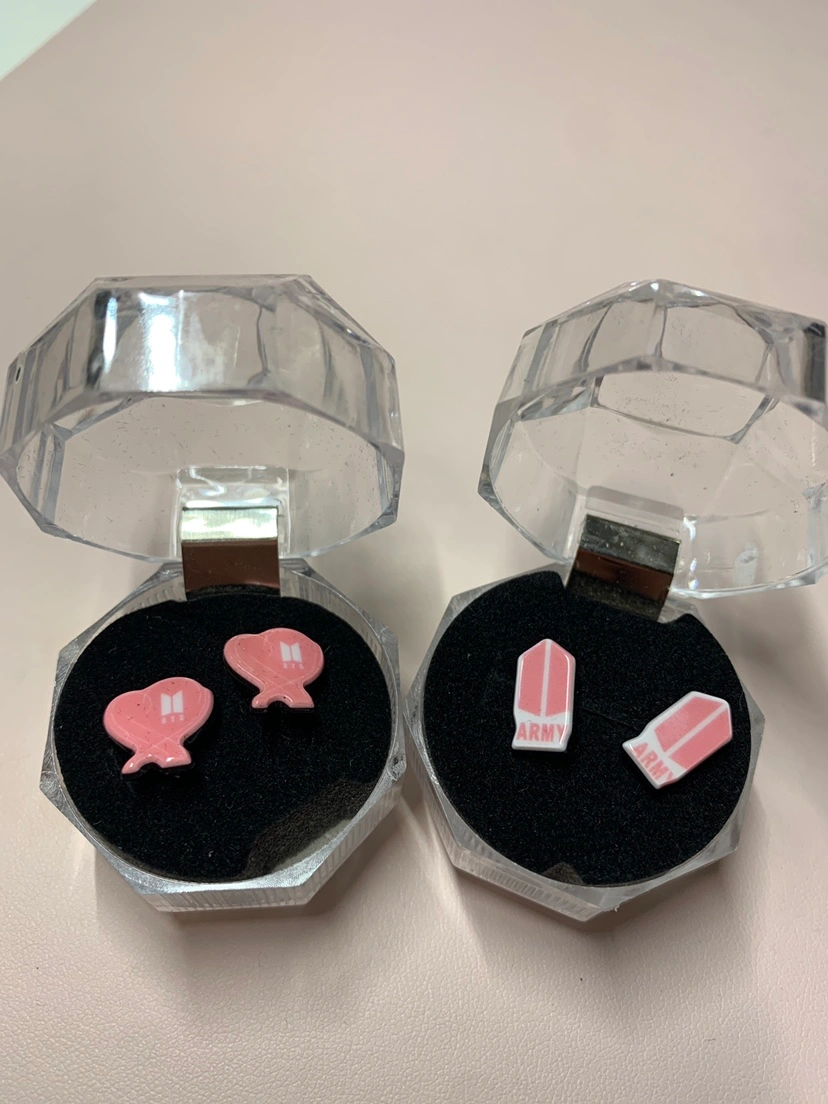 Pink BTS Logo Earrings in Heart and Army Logo. Comes with two boxes.