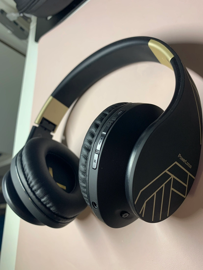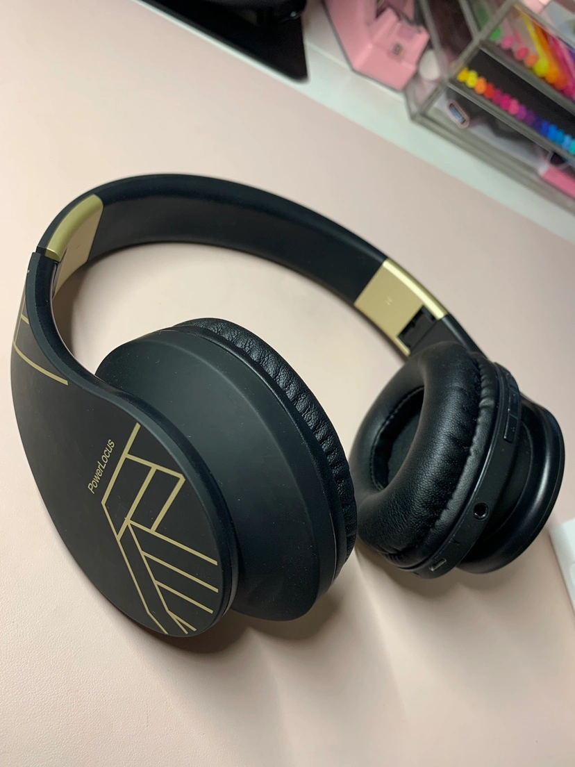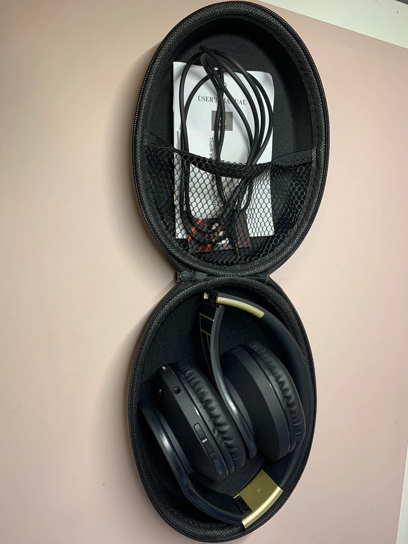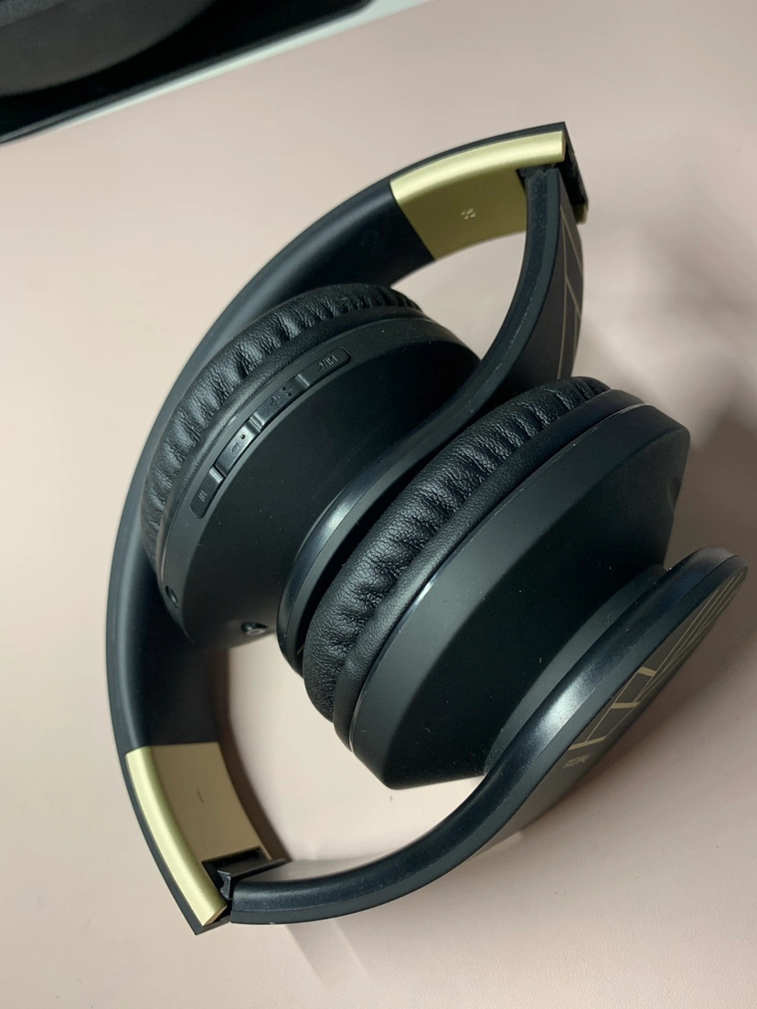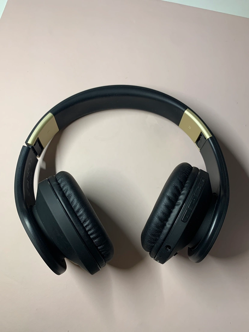 Black wireless headphones with gold accents. They have a built-in microphone and volume controls. Bluetooth or wire connected. Easy and simple to use and set up. Includes wire and both instruction manuals.