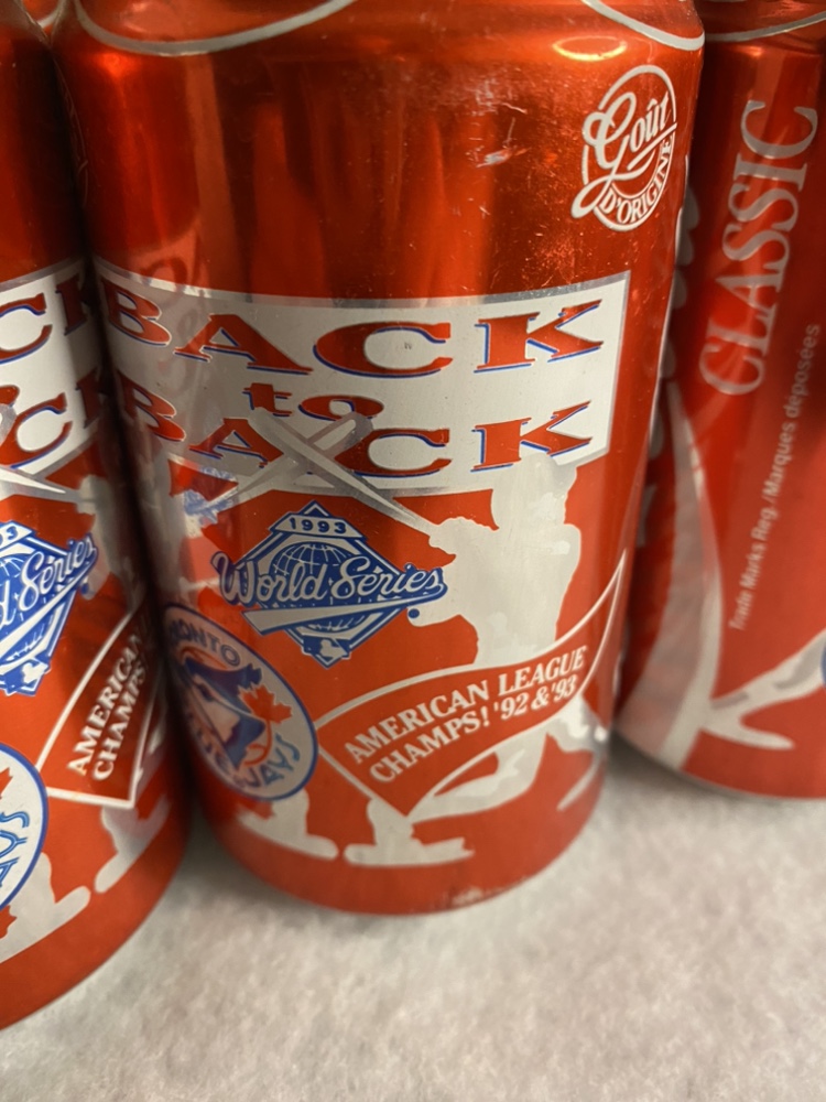 1992 MLB World Series Champions Toronto Blue Jays and 1993 Back To Back Coca-Cola Classic Cans 355 ml. Canadian Bilingual French / English. Pre-Owned. Good condition. Very slight shelf wear.