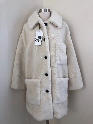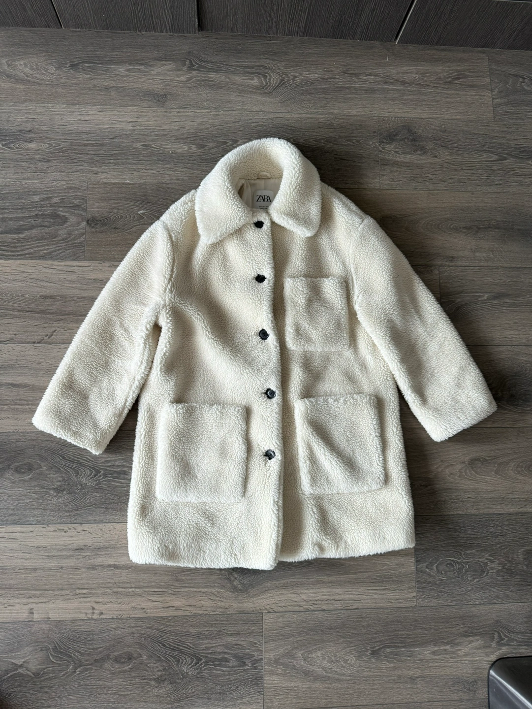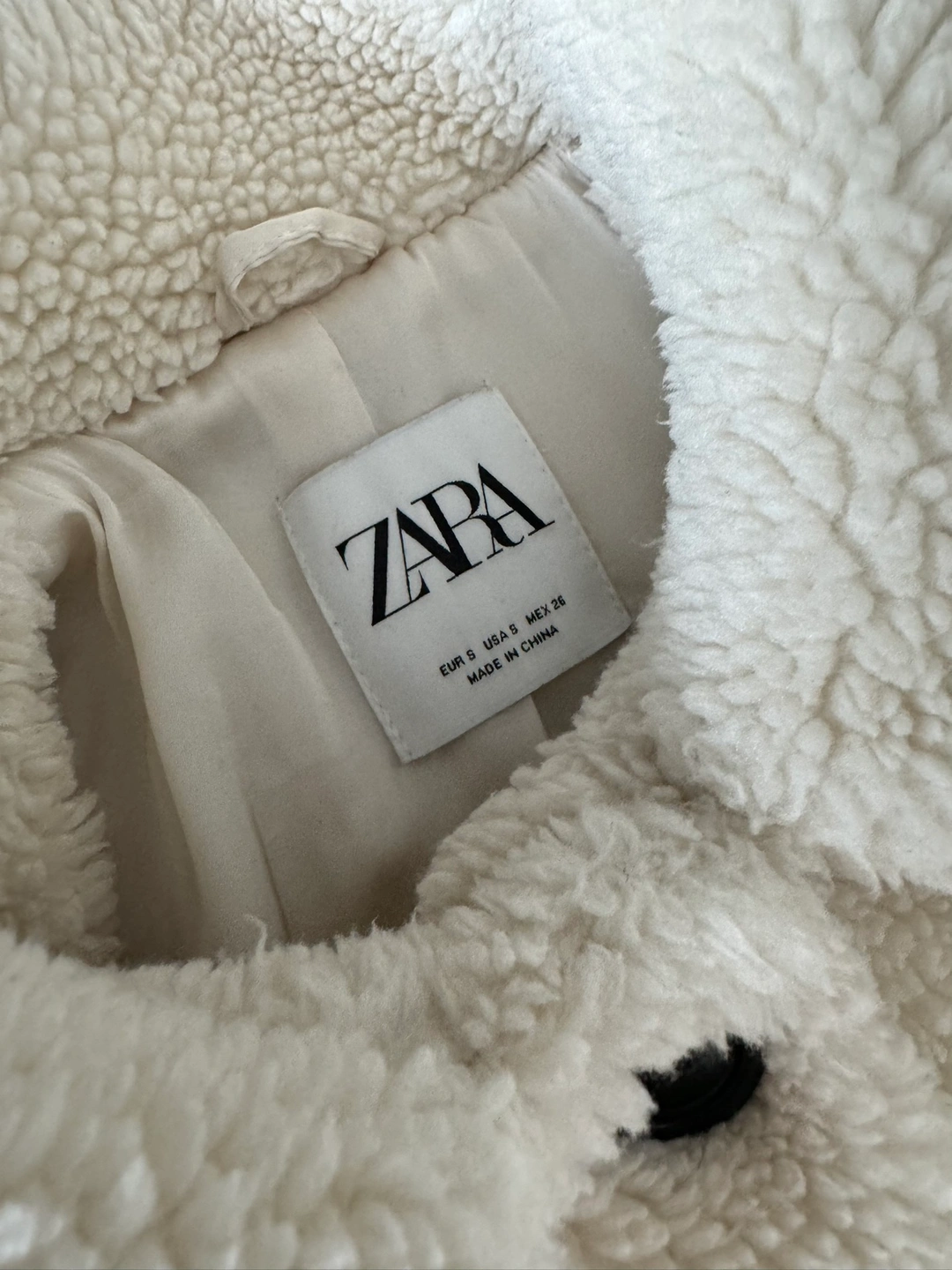 Super cute Teddy Sherpa Zara jacket - has a soft silk lining and a super fluffy exterior. Super cute for the fall / winter and fits small to large very nicely due to oversized fit.