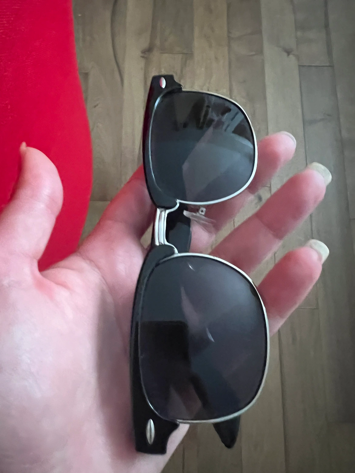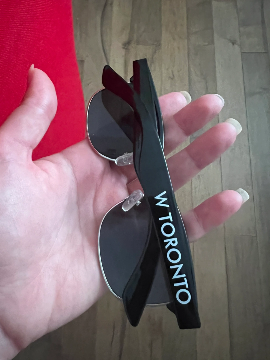 Black plastic sunglasses with silver detailing. "W Toronto" is printed on the side of the sunglasses. Unisex .