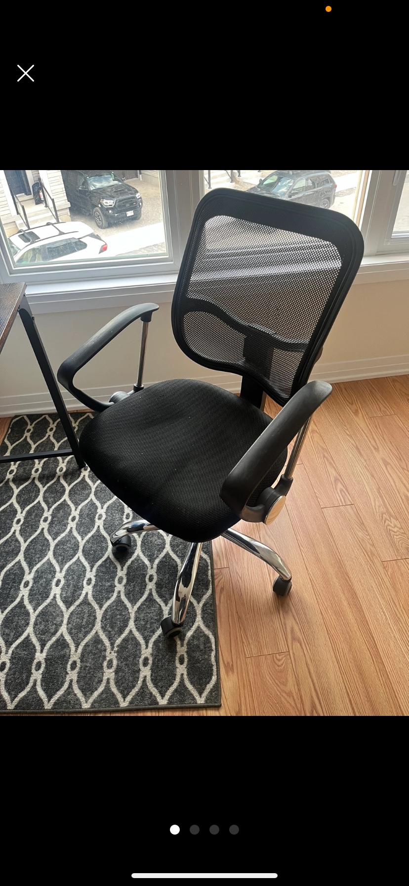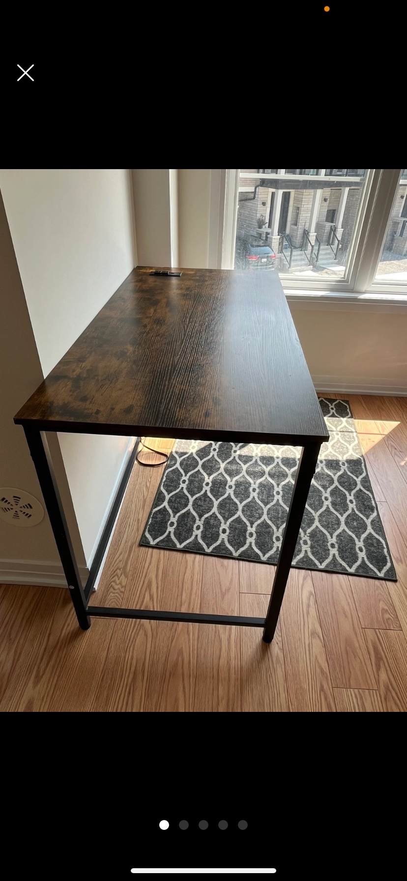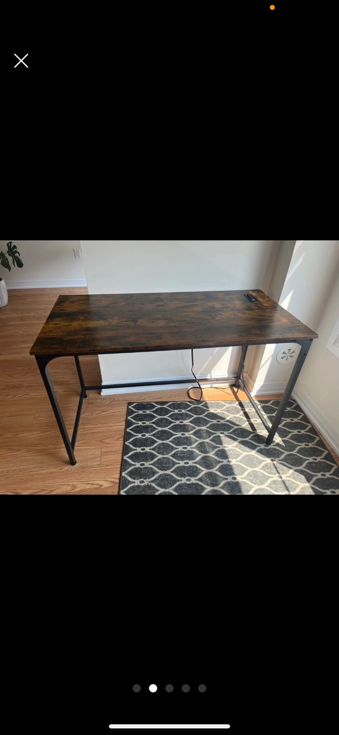 A desk and chair set, perfect for your home office. The desk has a woodgrain laminate finish and a black metal frame. The chair has a mesh back and a black fabric seat. Already disassembled easy to transport. USB and outlet top right corner of desk!