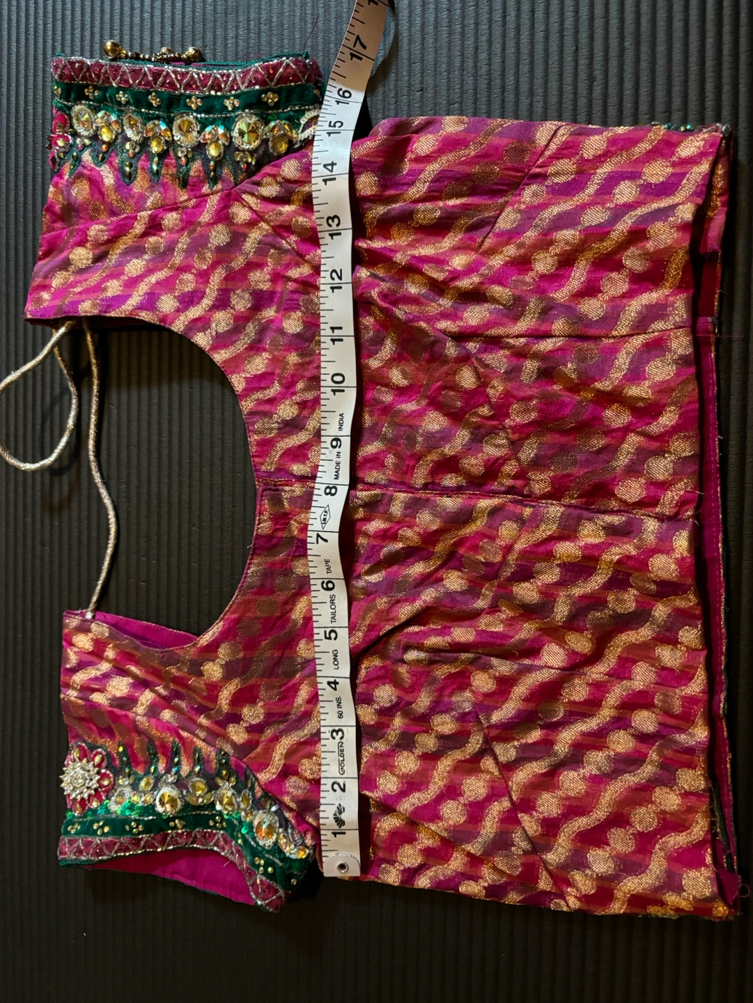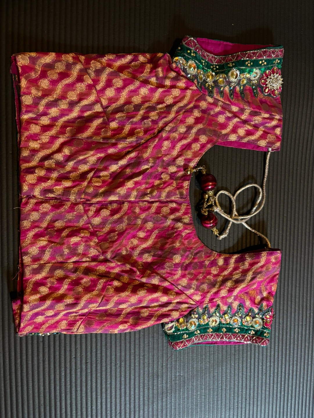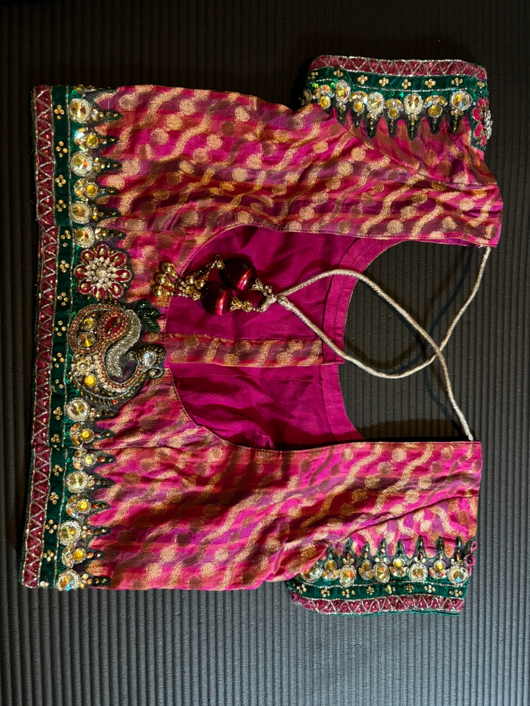 Beautiful pink and gold embellished blouse. It has green, silver and gold embellishments. with a peacock design on the back. The blouse has a tie closure and short sleeves.