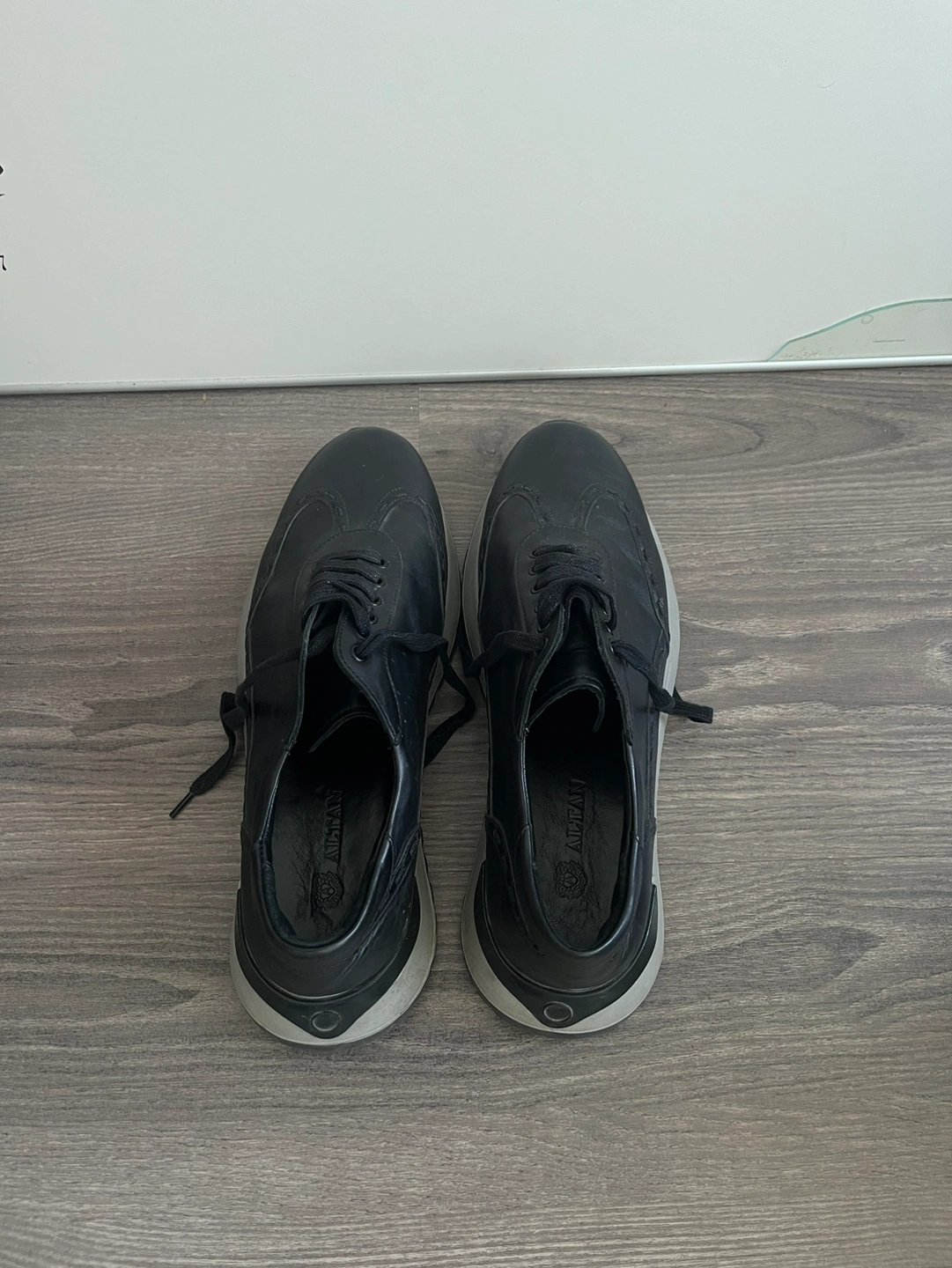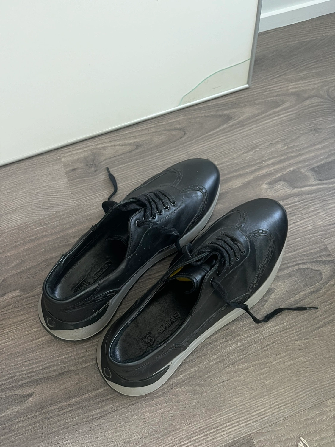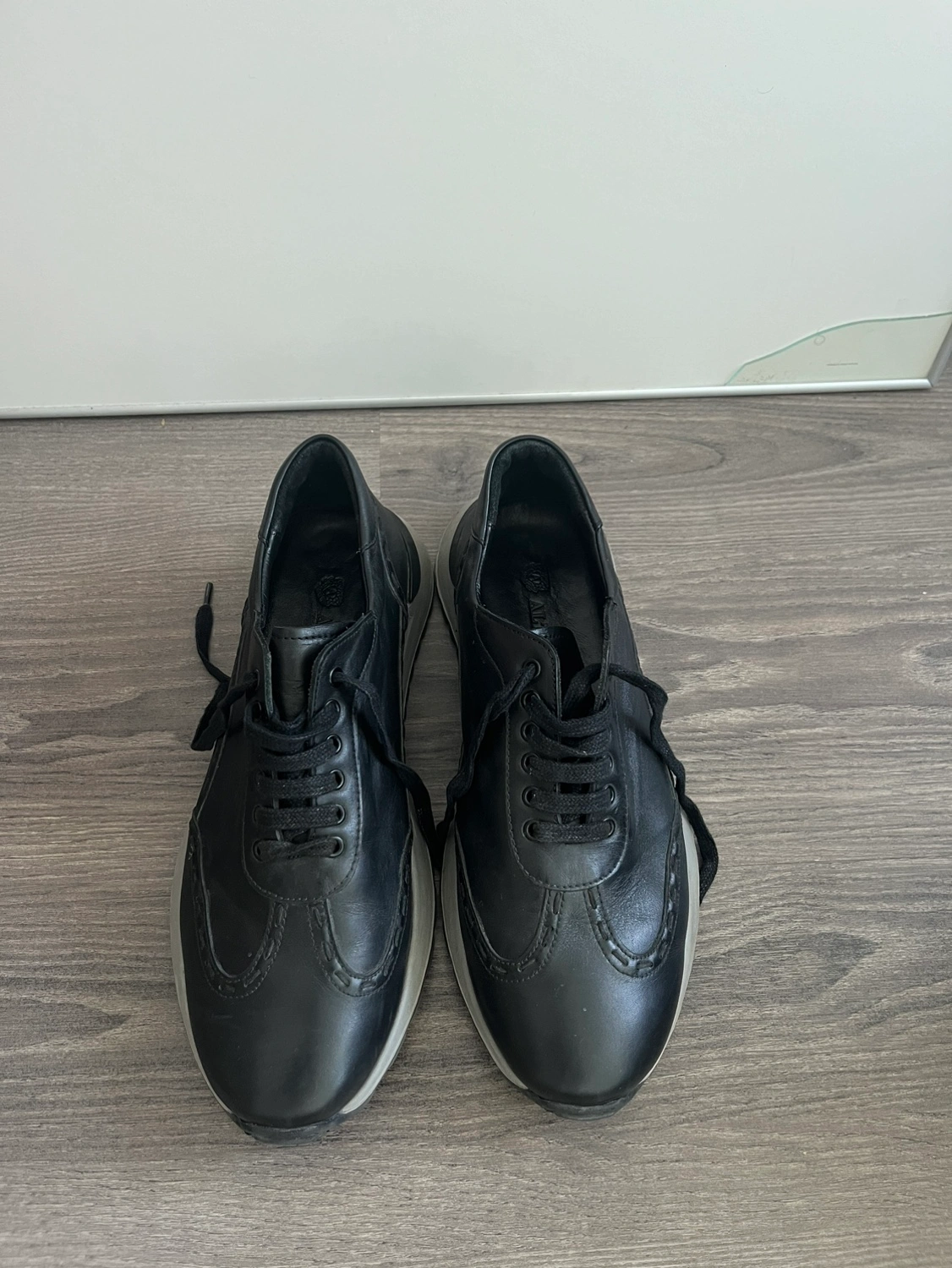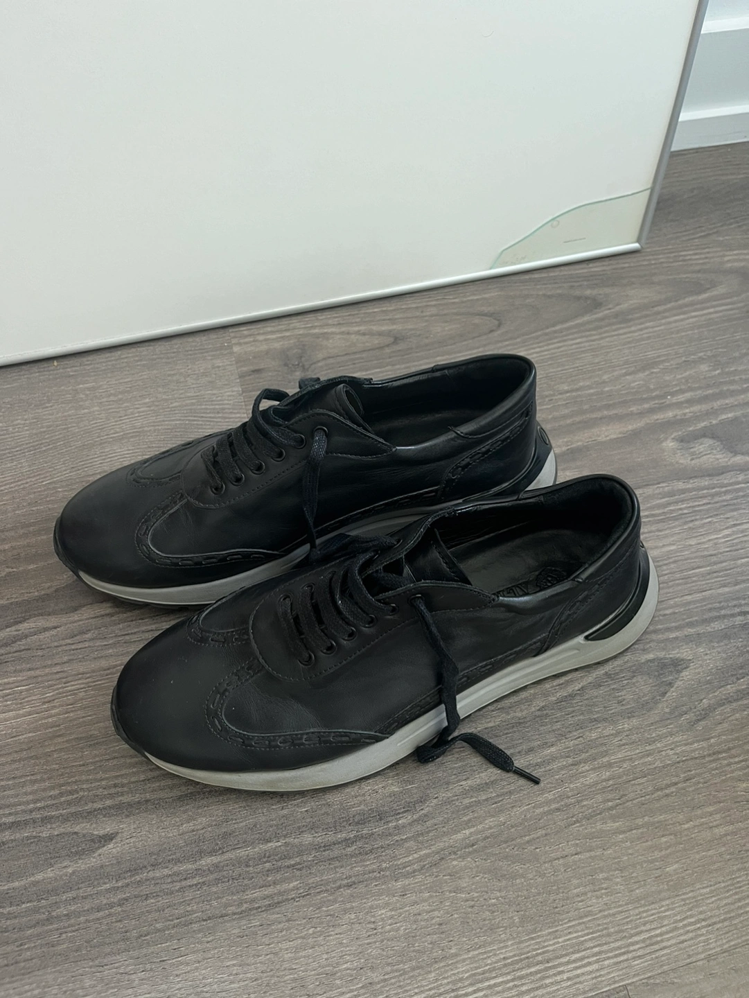 Black leather sneakers with white sole and black laces. They are in good condition. Size EUR 43 / US 11