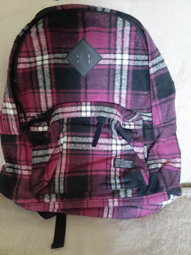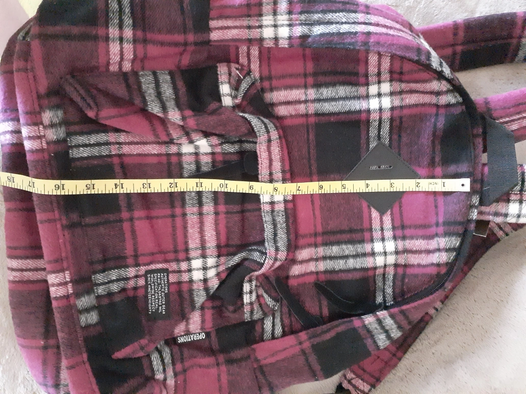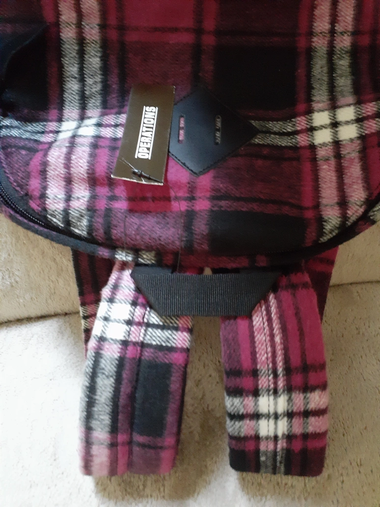Brand new Black, white, and pink plaid backpack with same colored straps and zipper pull. It features a front zippered pocket with a inner zippered and elastic pockets.