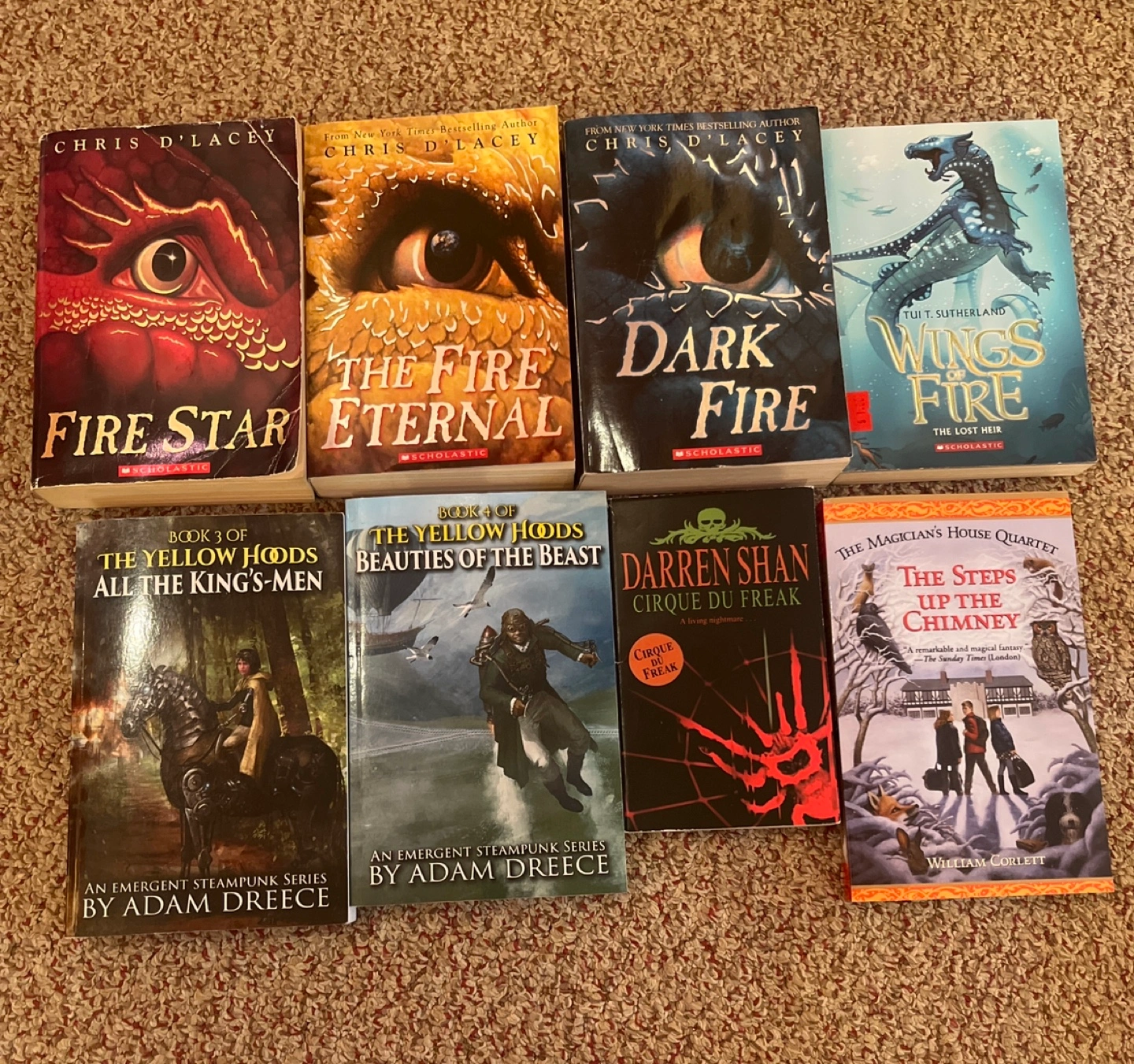 Assorted fantasy novels, including titles like Fire Star and The Steps Up the Chimney. The books are in varying conditions.