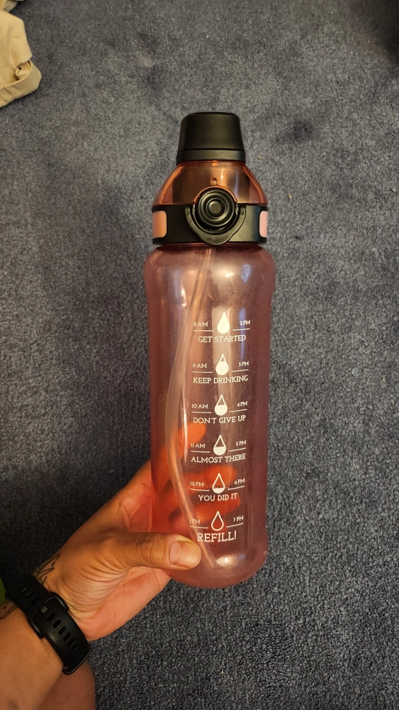 Large pink water bottle with a straw and a motivational message on the side. straw no longer works but can sip from it or replace lid.