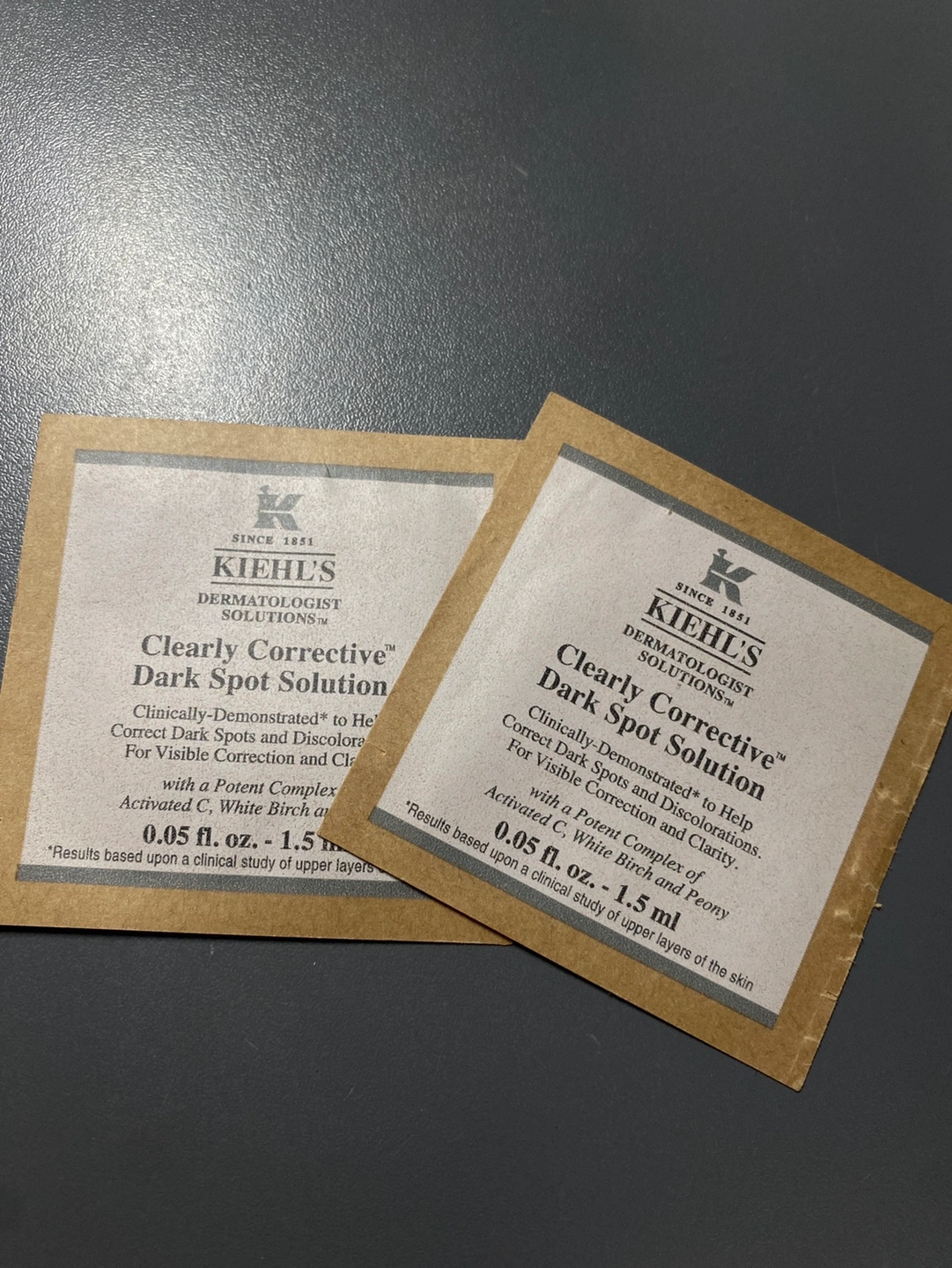 Two unopened samples of Kiehl's Clearly Corrective Dark Spot Solution. Each sample is 0.05 fl. oz. or 1.5 ml. I’m giving this away to someone that could put it to good use!