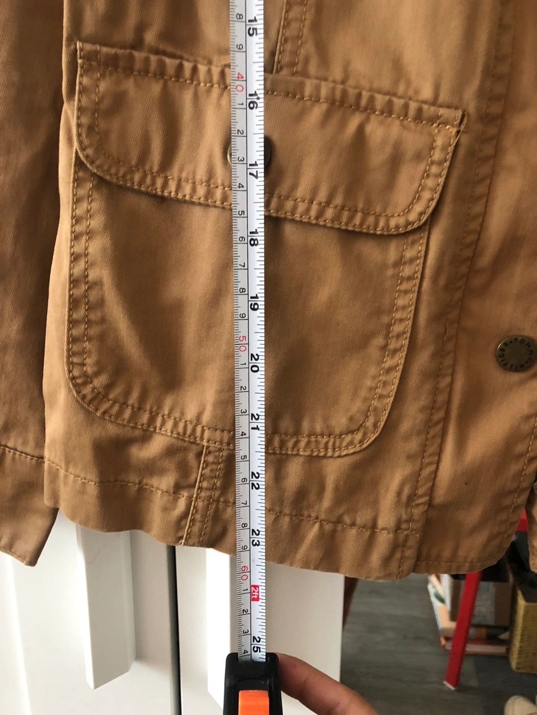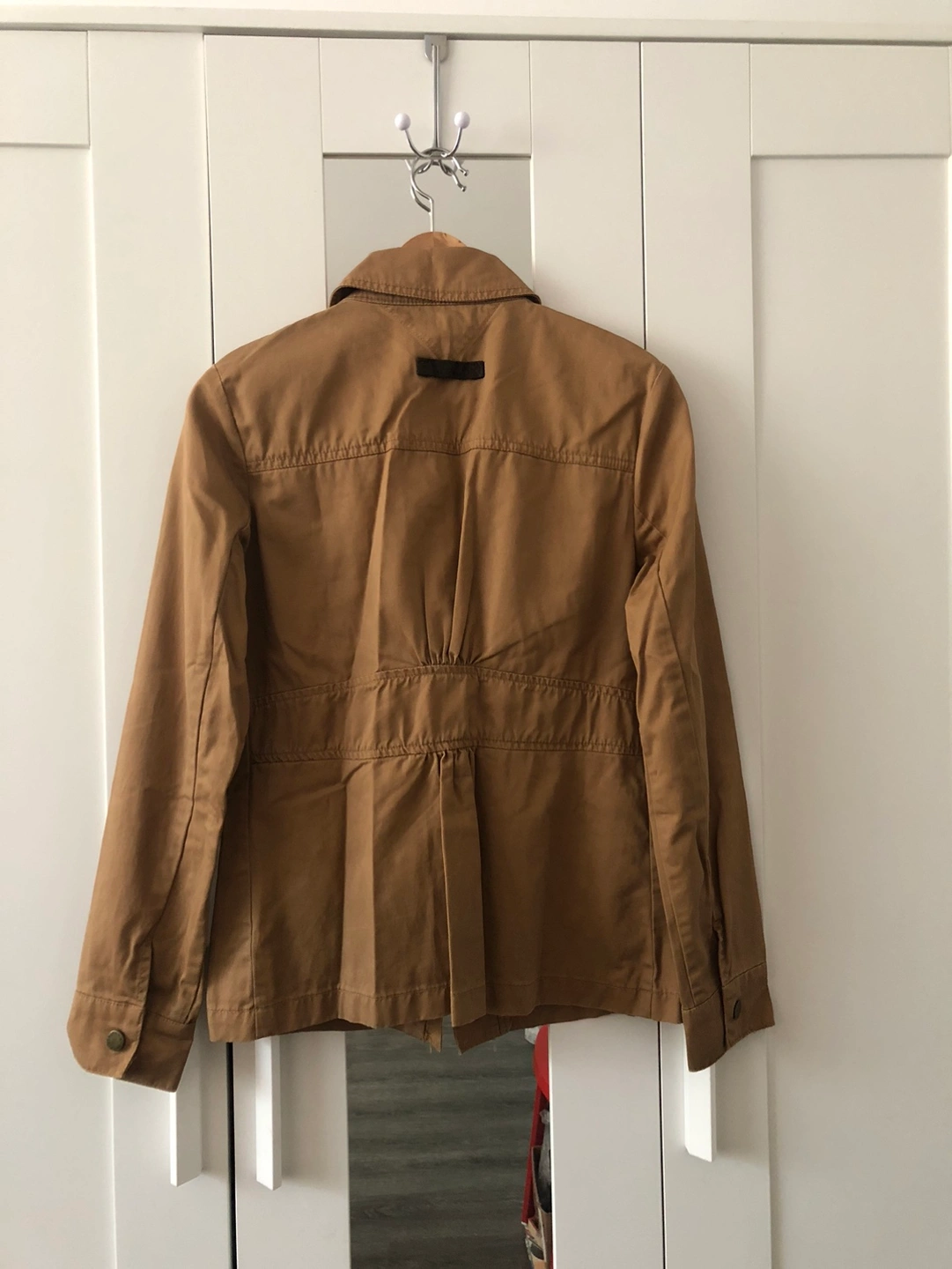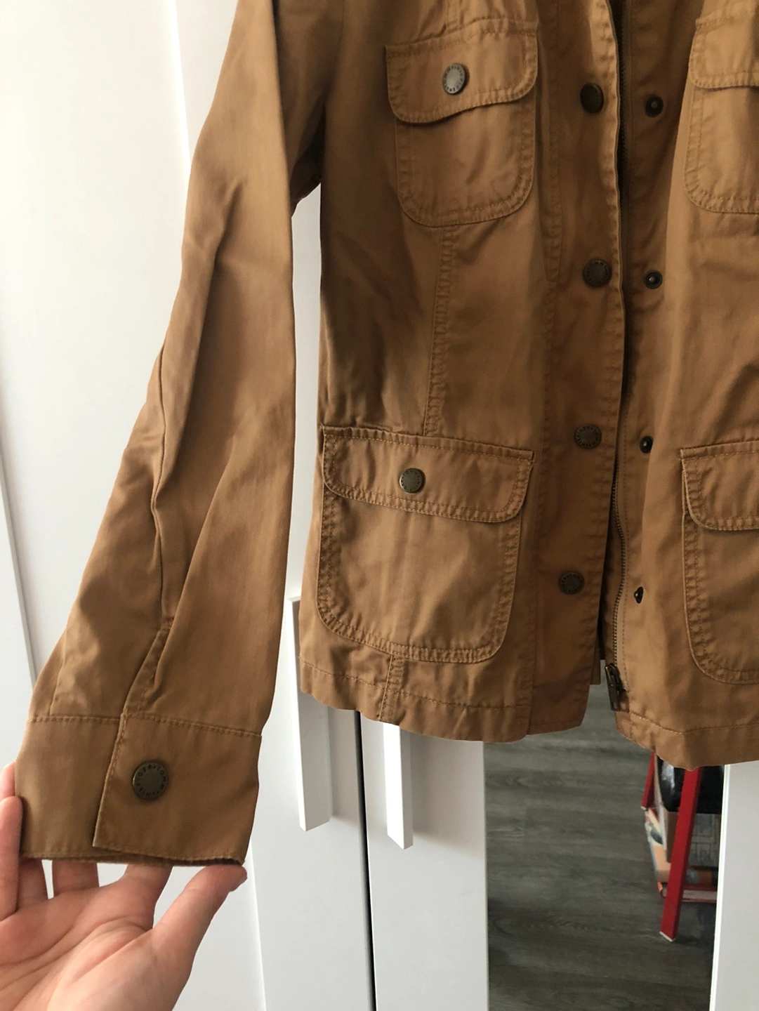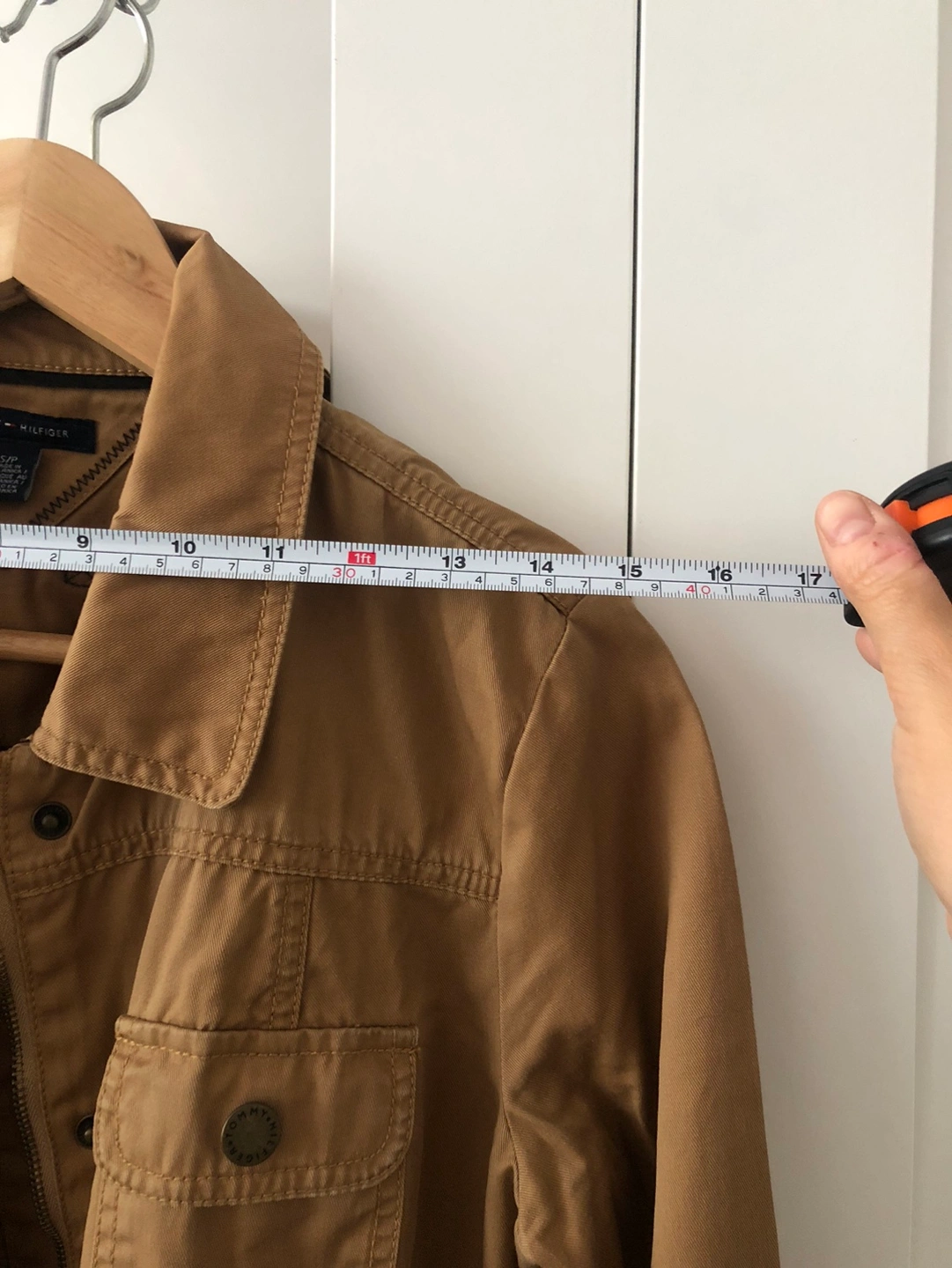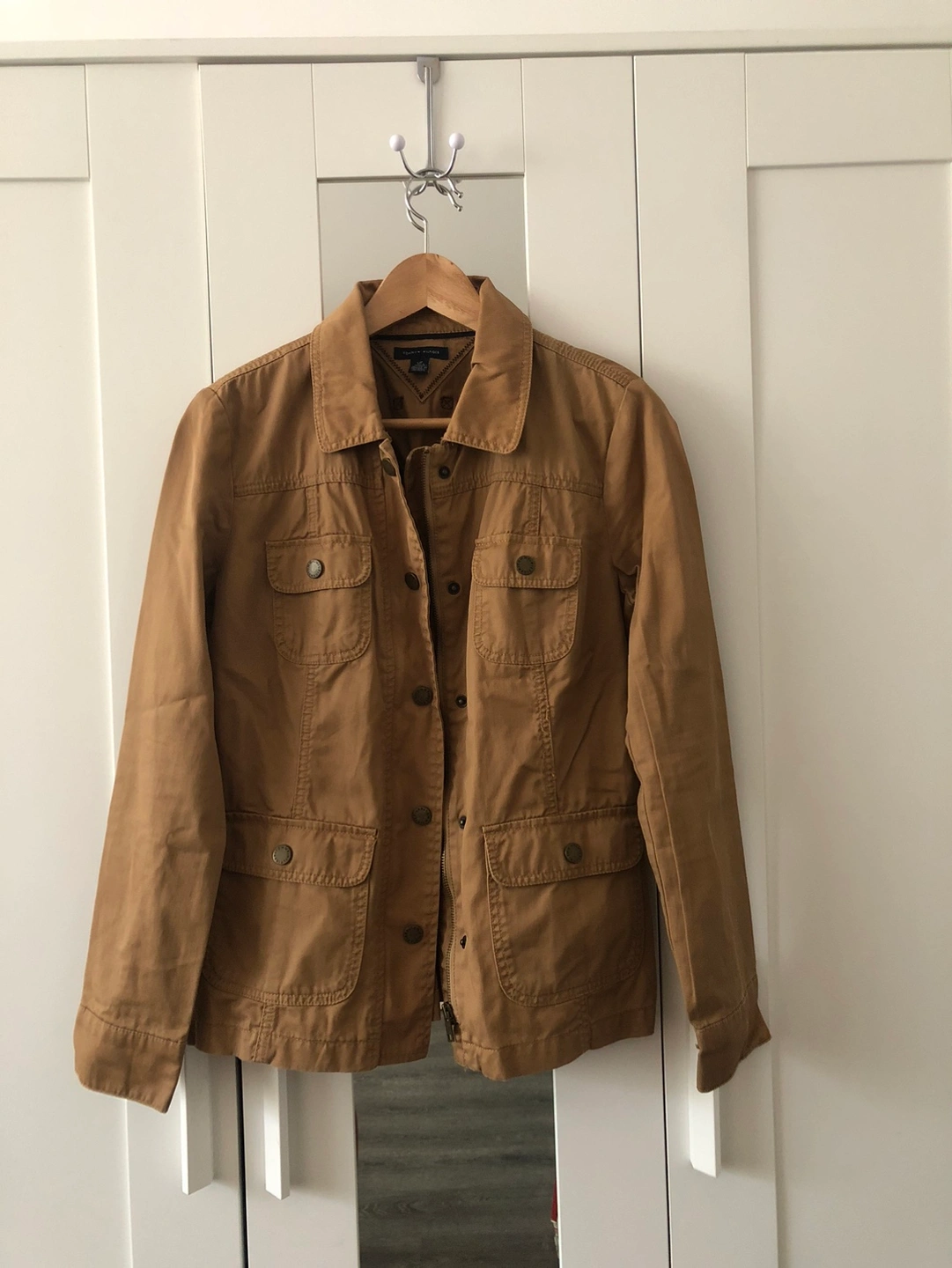 Tan brown Tommy Hilfiger jacket with a zipper and snap button closure and four front pockets.