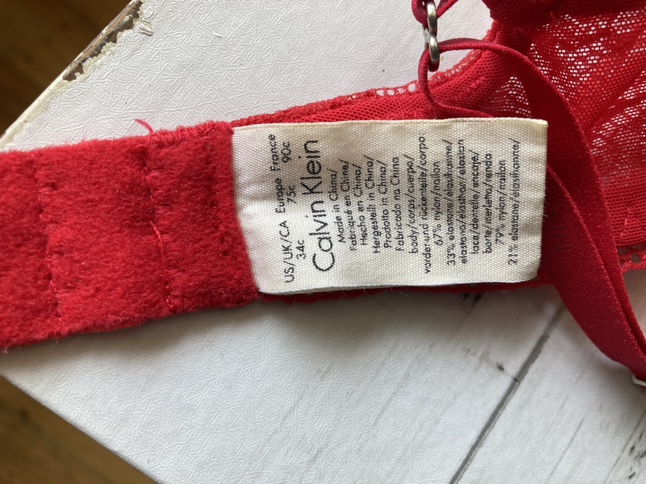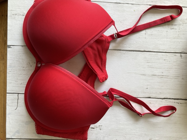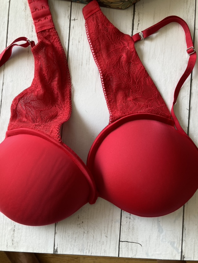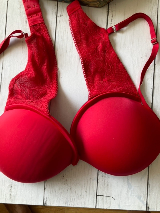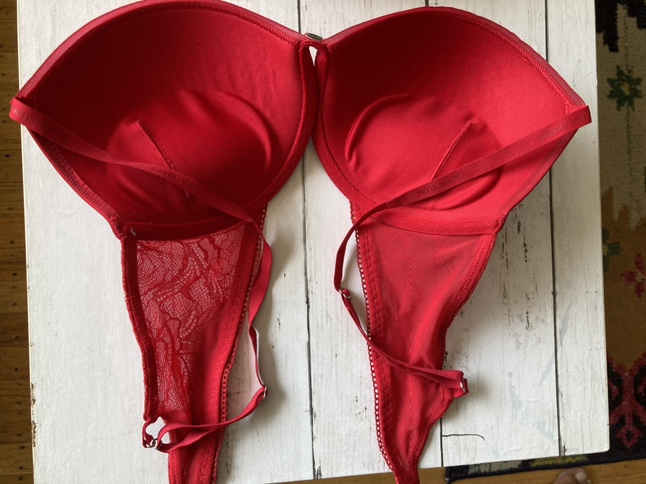 This is a red push-up bra with adjustable straps and a hook closure in the back. Gently worn and well padded.