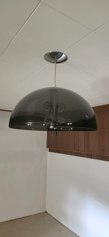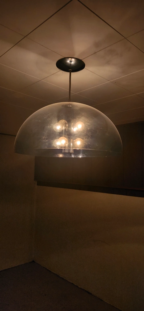 A mid-century modern chandelier with a clear plastic dome shade and a chrome finish. The chandelier is in working condition and includes the lightbulbs.