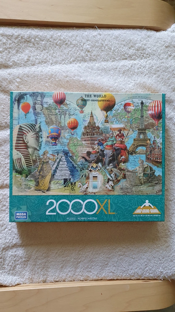 This is a brand-new, never opened 2000 piece jigsaw puzzle. The dimensions of the completed puzzle is shown in the second photo. It has a world map theme featuring famous landmarks and colourful hot air balloons. The box is still sealed. A perfect gift for someone who loves puzzles or for yourself!
