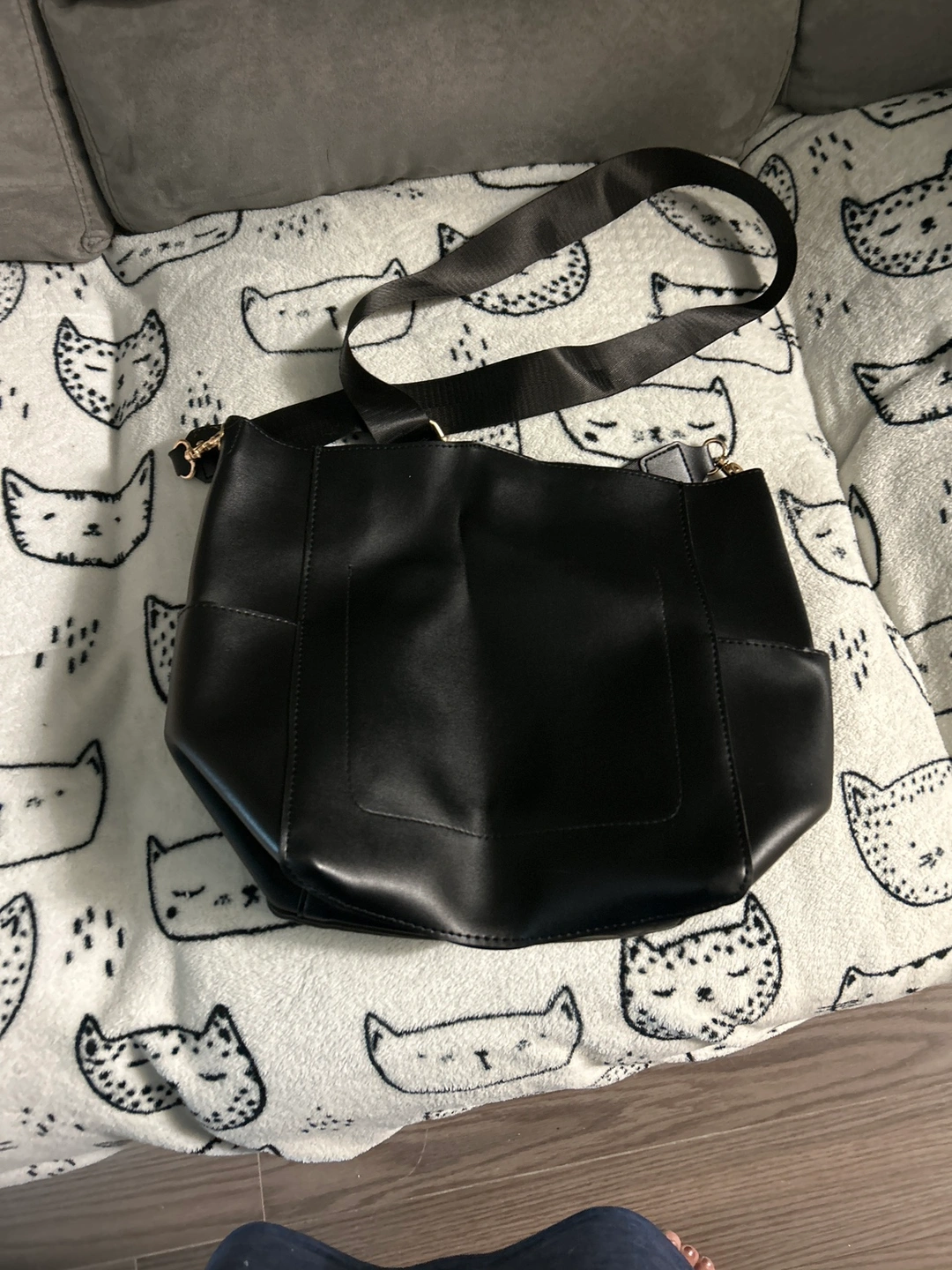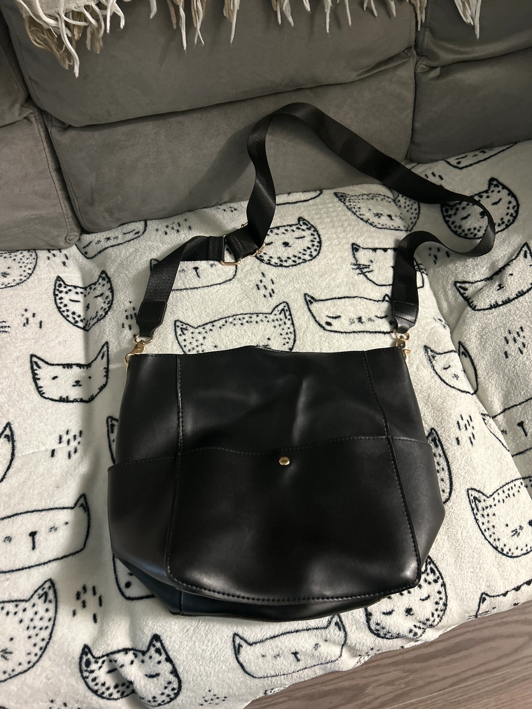 Black leather crossbody bag with a gold chain strap. The bag has a pocket on the front and is in good condition.