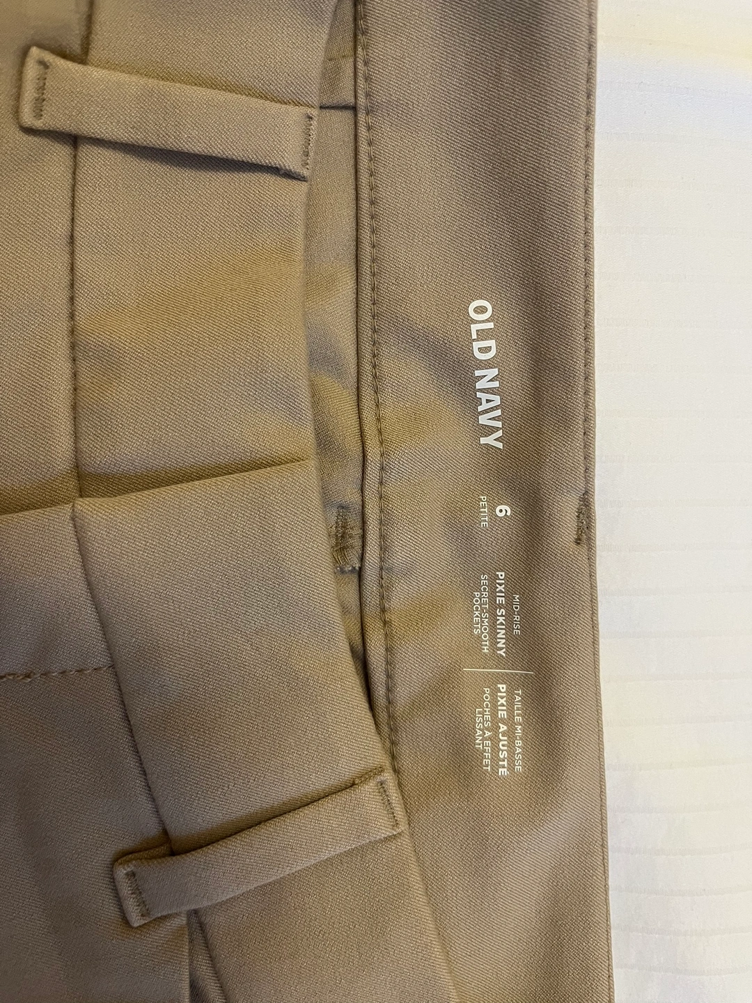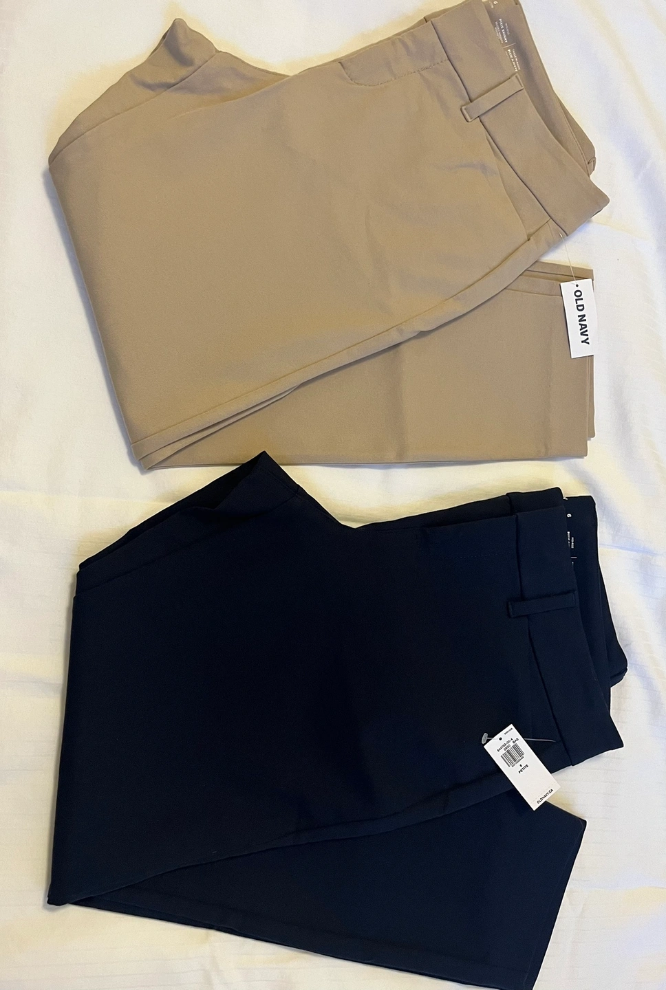 Two pairs of Old Navy Pixie dress pants. One is black, and the other is khaki . Originally bought for 49.99 each. Selling because I got the wrong size and can’t return them as the return date has passed.