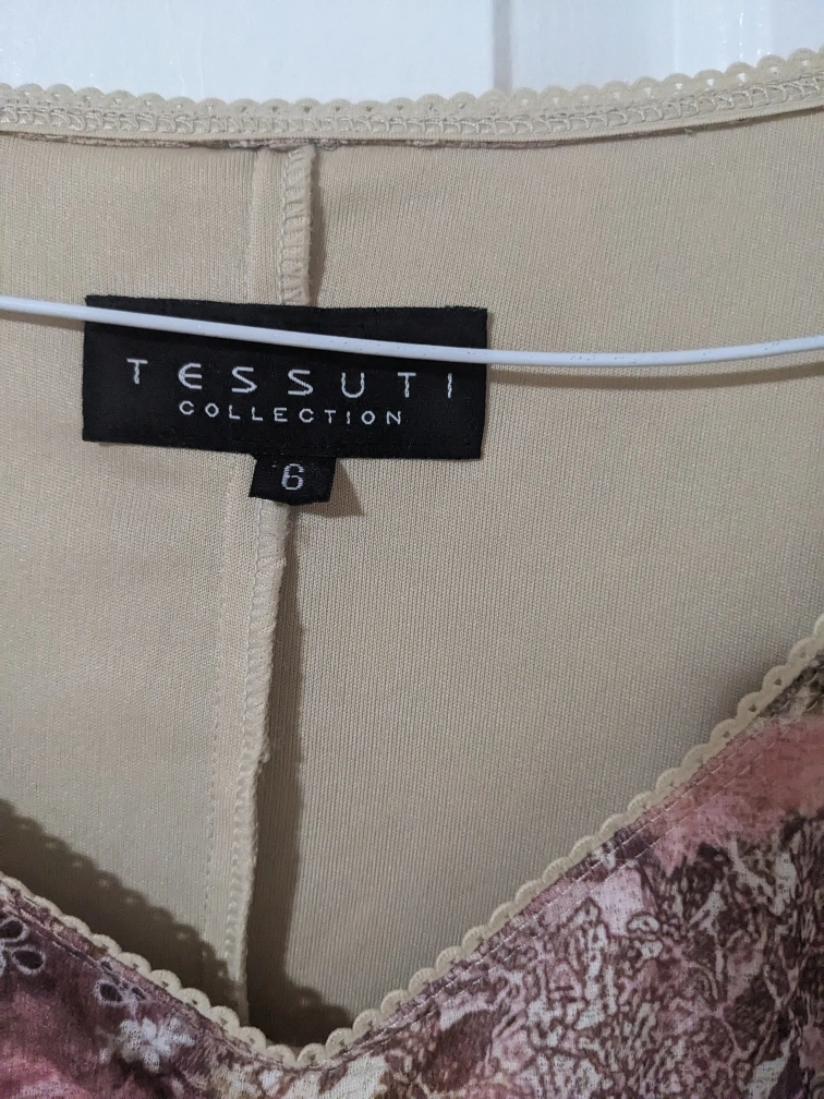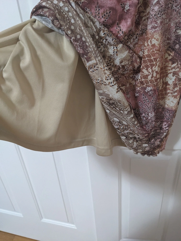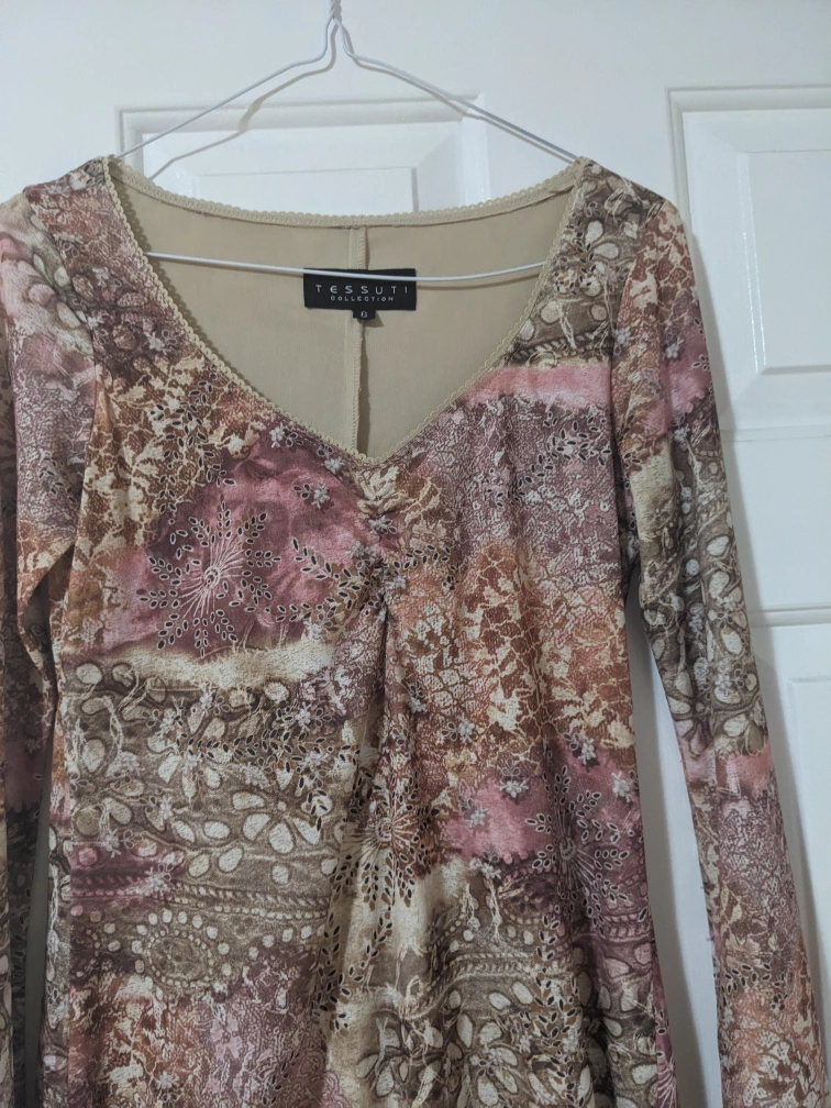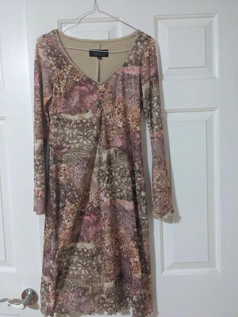 1000+Long-sleeved lined dress with a floral and abstract print. It has a v-neck and a flowy skirt.