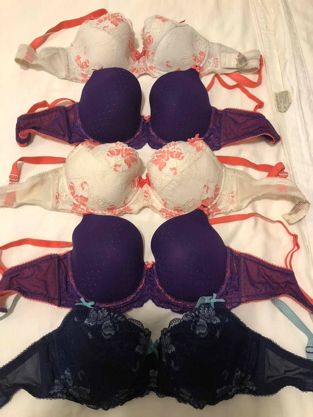 A collection of five bras in various styles and colours. 34DD. They were all purchased from the UK. I paid quite a bit originally, but they are too small for me now. They are very gently used.