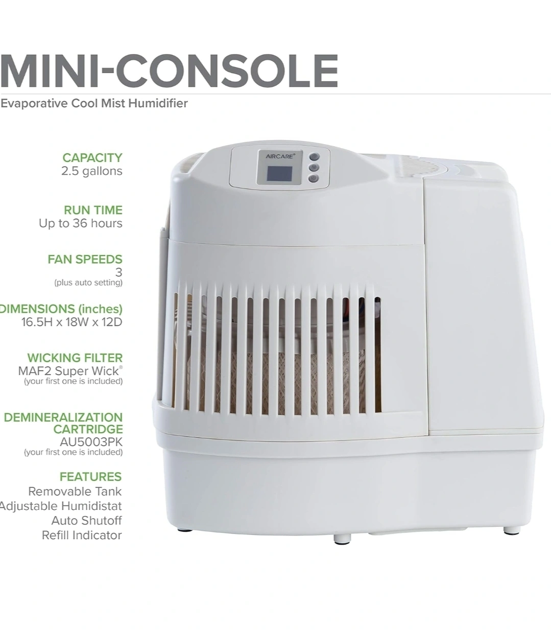 This is a used Aircare Mini-Console Evaporative CooThe AIRCARE MA0800 mini-console humidifier is an easy-to-use solution for medium sized homes. With a 9.46 litre capacity, it offers up to 36 hours of runtime to humidify the air and keep your family comfortable.