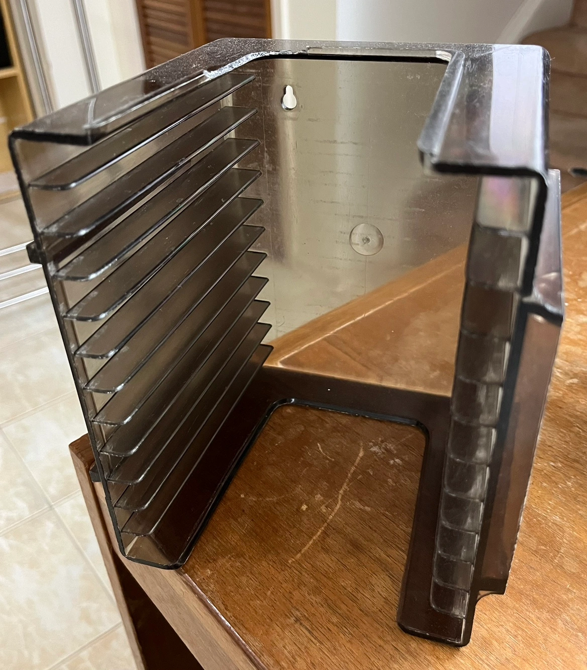 Clear plastic CD storage organizer with a capacity of 12 CDs. Can be mounted on a wall. Reason to give away is I use CD sleeve organizers instead now.