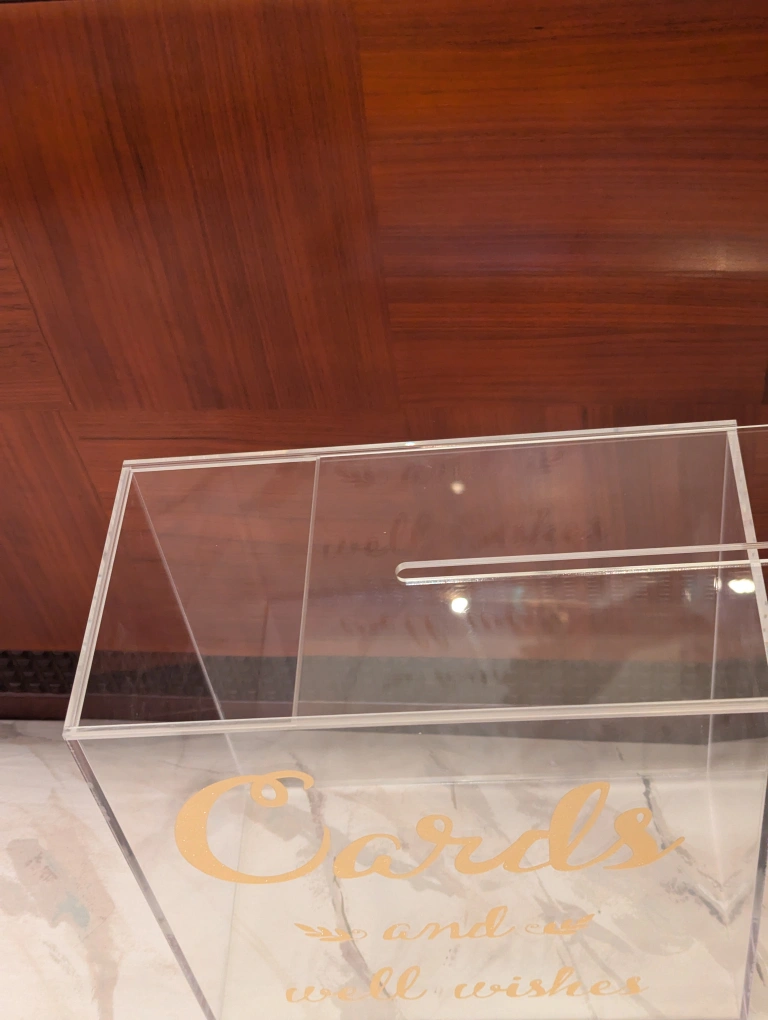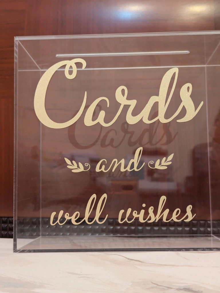 Clear acrylic card box with gold lettering. Has a slot on the top for inserting cards. Measures approximately 10" x 10" x 5.5".