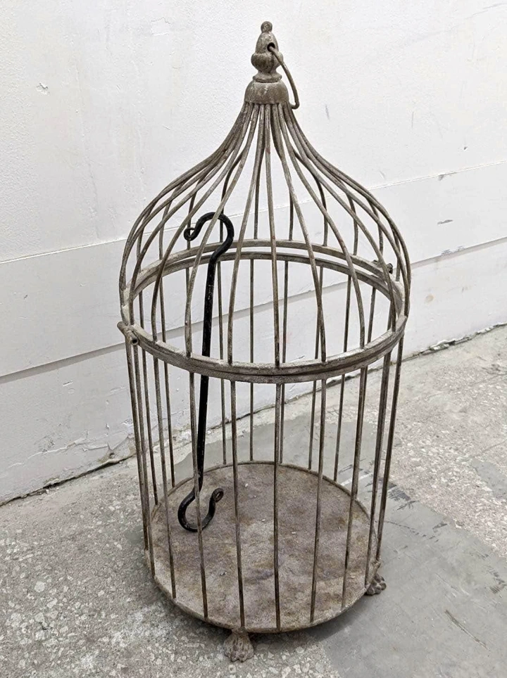 751A metal bird cage with a domed top. It has a hook on the top and on the inside. The base has four feet.