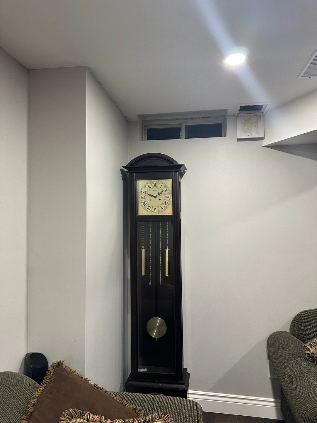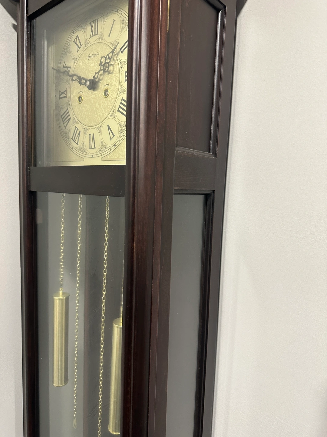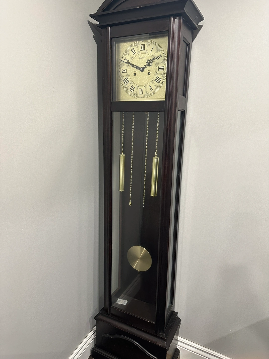 Tall standing grandfather clock with a dark wood finish. Features a glass front and a decorative design on the face. Includes pendulum and chimes.