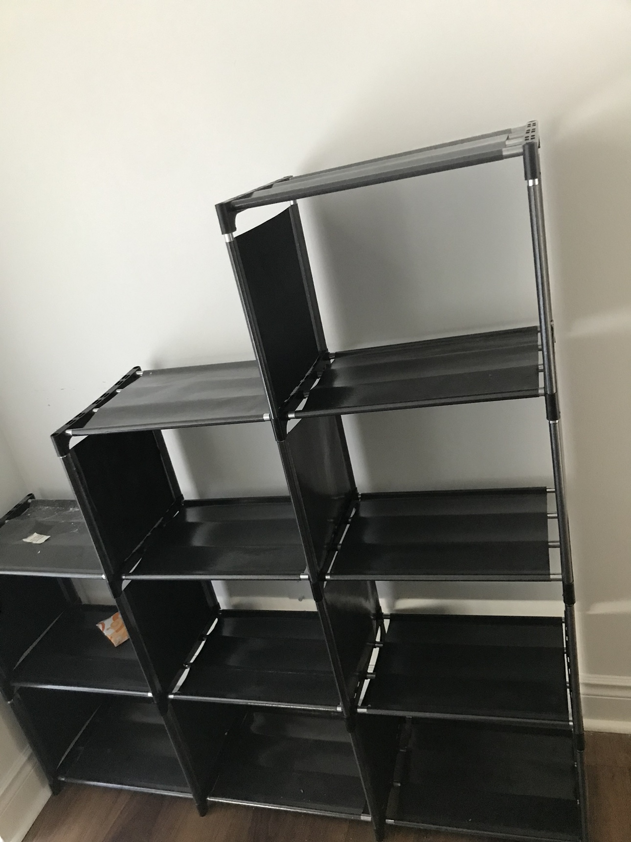 This shelf unit is made of black fabric and metal. It is collapsible and easy to assemble. It is great for storage in a small space. The unit is in good condition. Pick up only