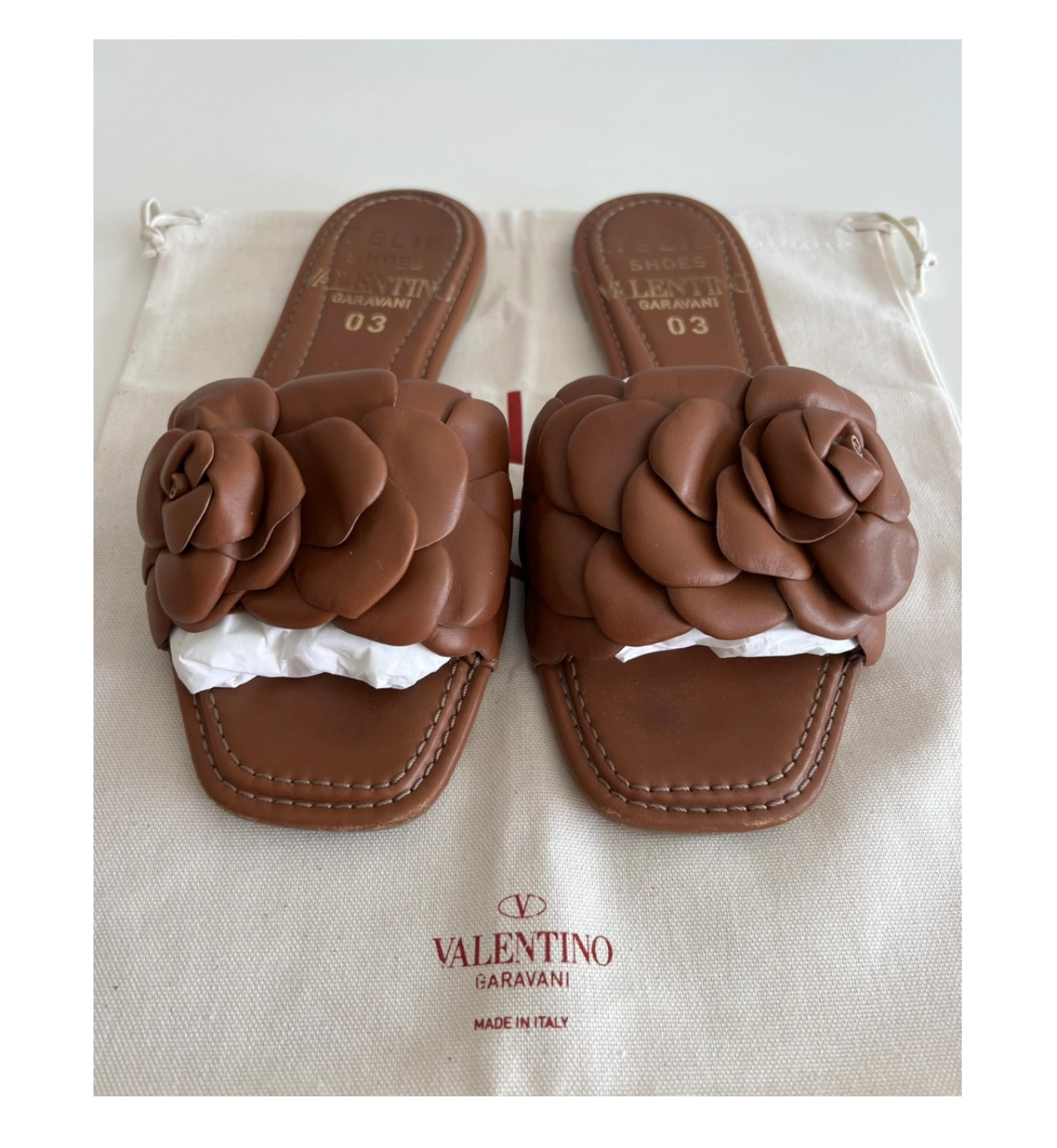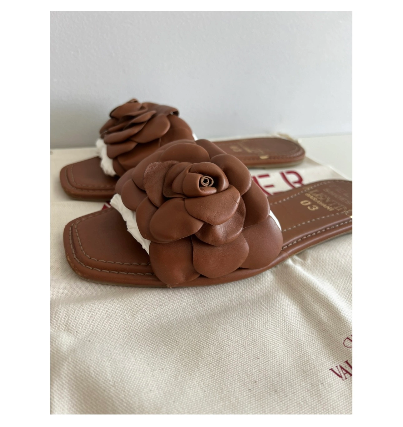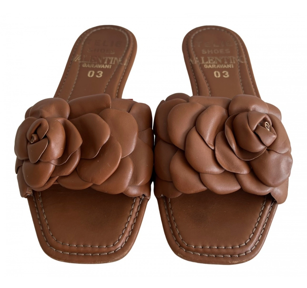 Brown leather slides with a large 3D rose detail on the front. Made in Italy. They are size 41