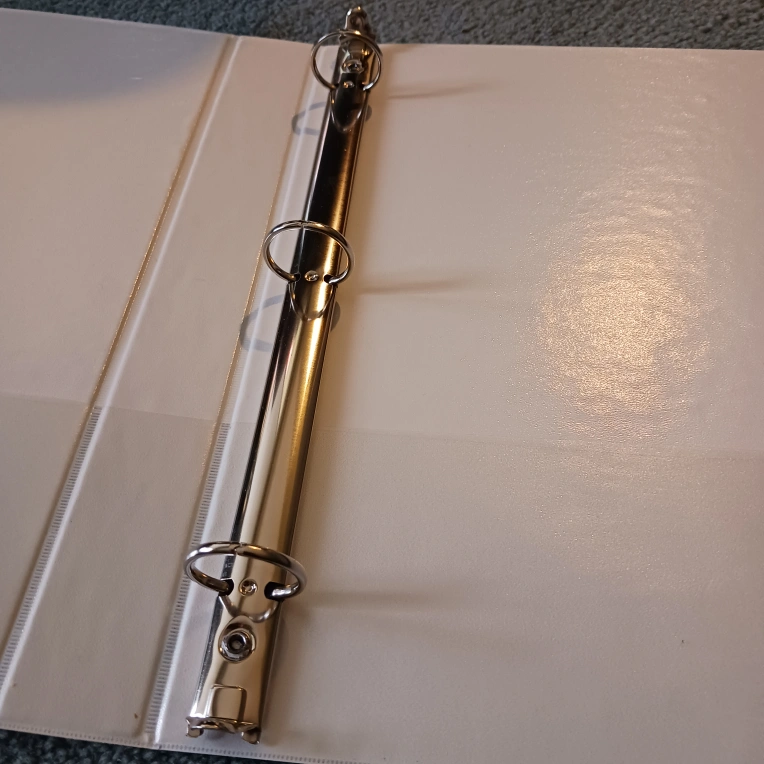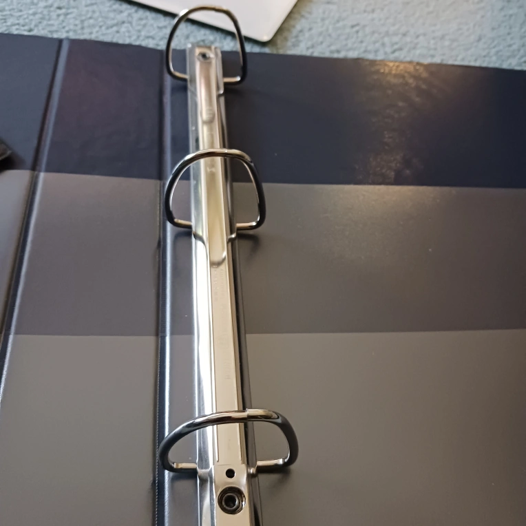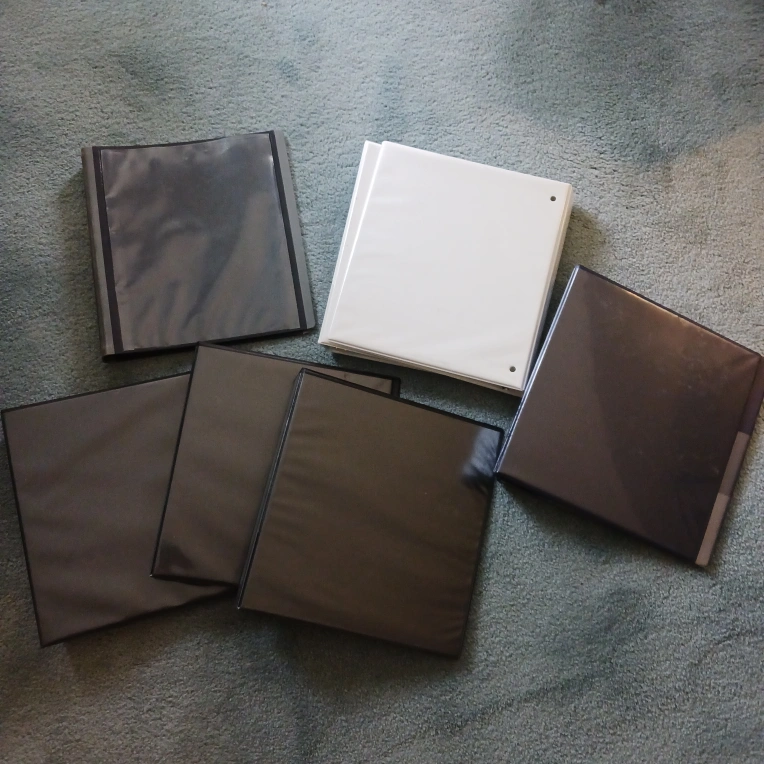 Assorted binders in black, white, and navy. The white binders have circular rings, the dark coloured ones have rings that are more D-shaped.
