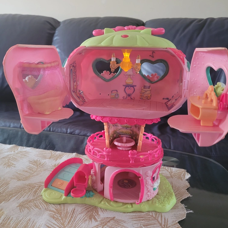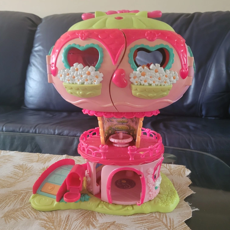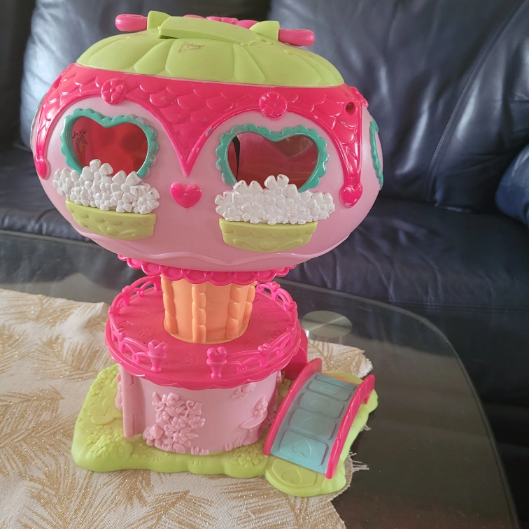 The playset is a pink and green hot air balloon with a slide and bridge. There are multiple rooms and features within the playset. The playset does not include any ponies or accessories.