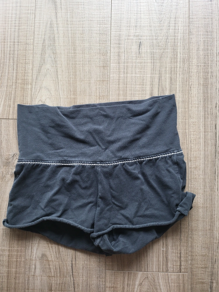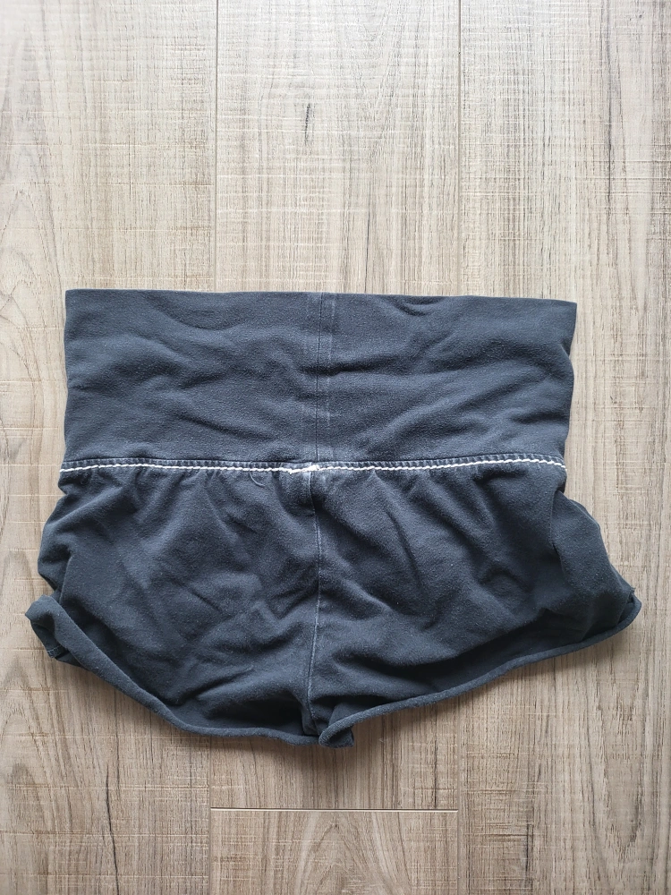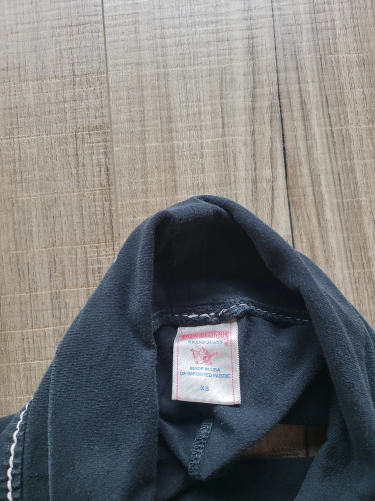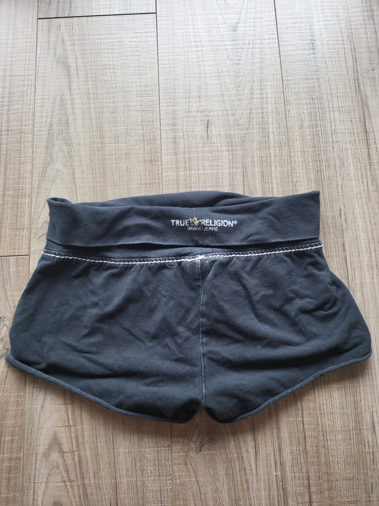 Black True Religion shorts with white stitching. The shorts are a high waisted style. They have a relaxed fit. The material is soft and stretchy.
