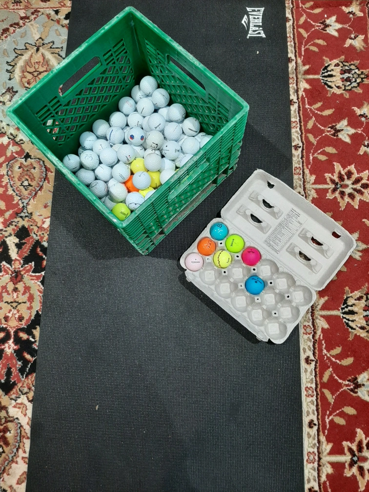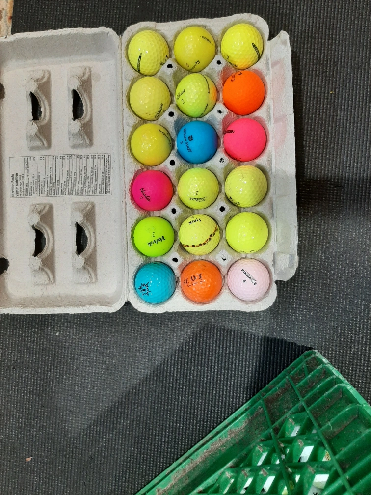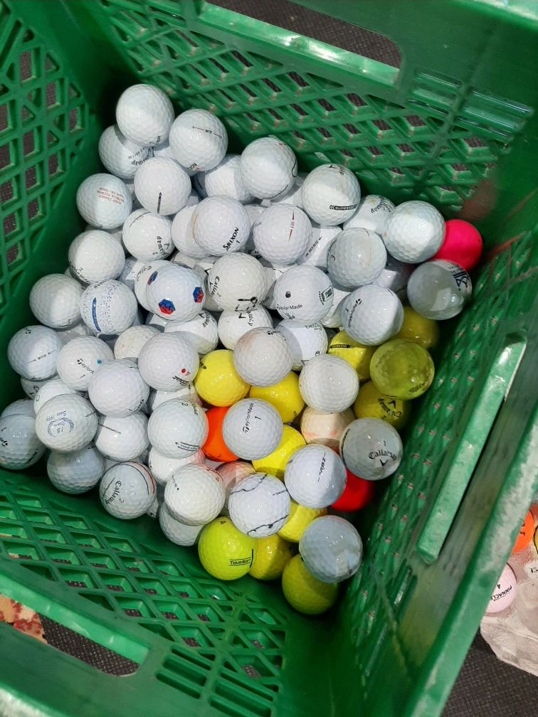 340-345 GOLF BALLS CLEANED AND DRIED. NO CRACKS OR TEARS. 22 ARE BRIGHT COLOURS, MOSTLY YELLOW. $170 FOR THE LOT. $8 PER DOZEN. BALLS ARE GENTLY USED IN VERY GOOD CONDITION. AVAILABLE CURBSIDE OR AT A LOCAL GAS STATION. I WOULD GIVE MY ADDRESS UPON CONFIRMATION OF MEETING, JORDAN