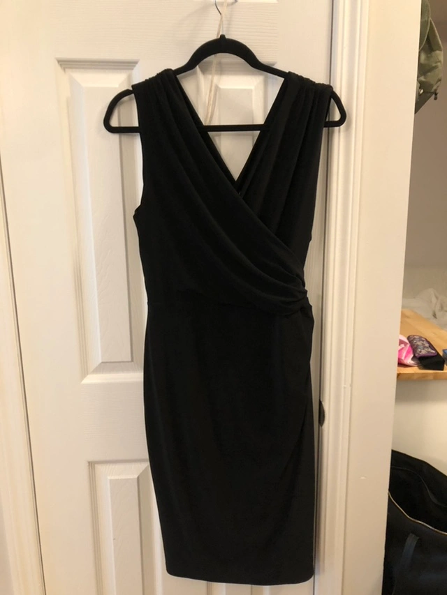 384Beautiful black sleeveless dress with a v-neckline. The dress has a fitted silhouette with a side ruching detail. The fabric is soft and stretchy. The dress is fully lined. Perfect for a special occasion or evening out.
