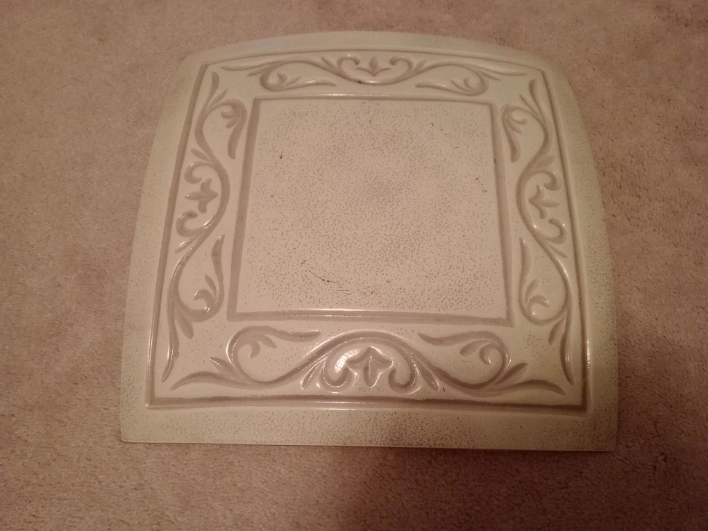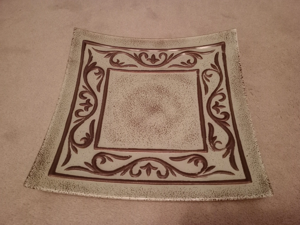 106This is a decorative tray with an ornate design around the edge. It can be used for serving, or as a decorative piece in your home. Pick up only