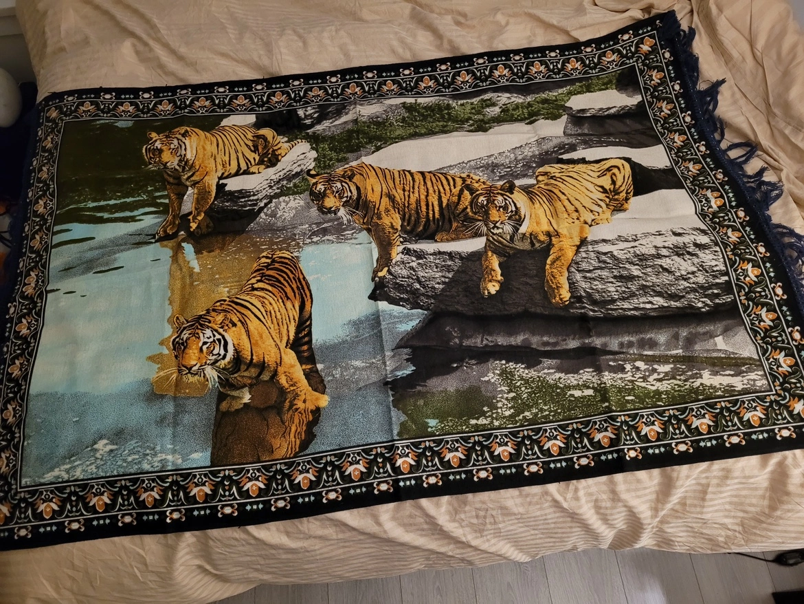 This tapestry features a beautiful image of tigers and comes with a fringe. It would be a great addition to any home.