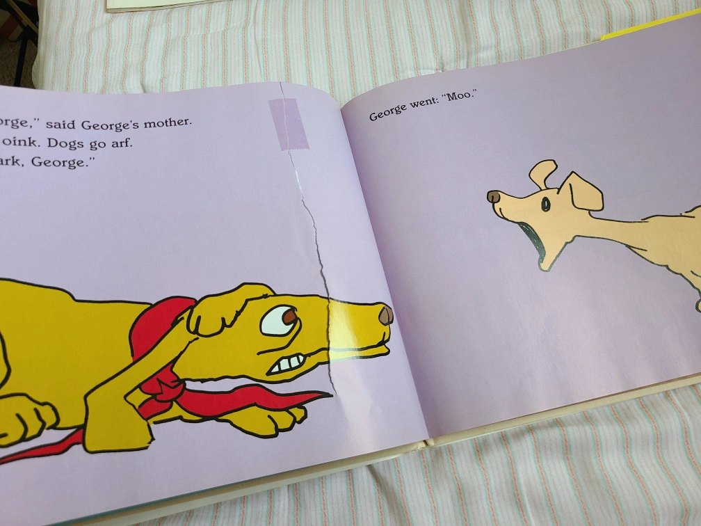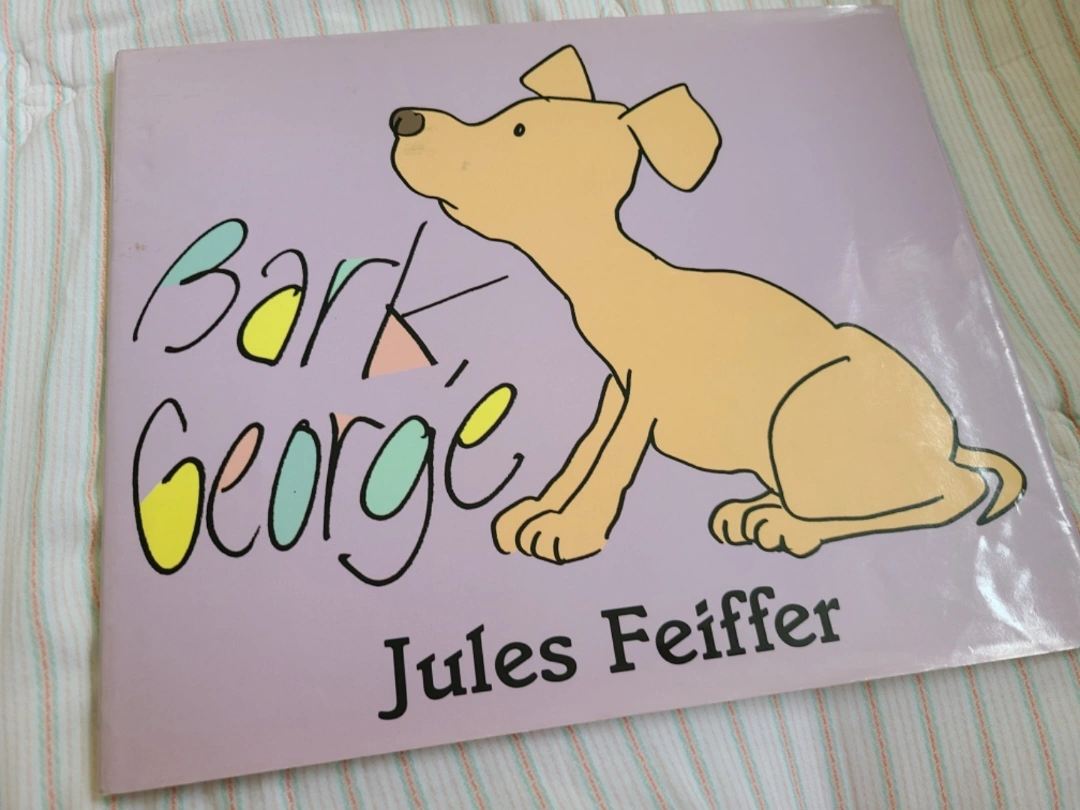 A hardcover copy of "Bark, George" by Jules Feiffer. One of the pages is torn (see picture).