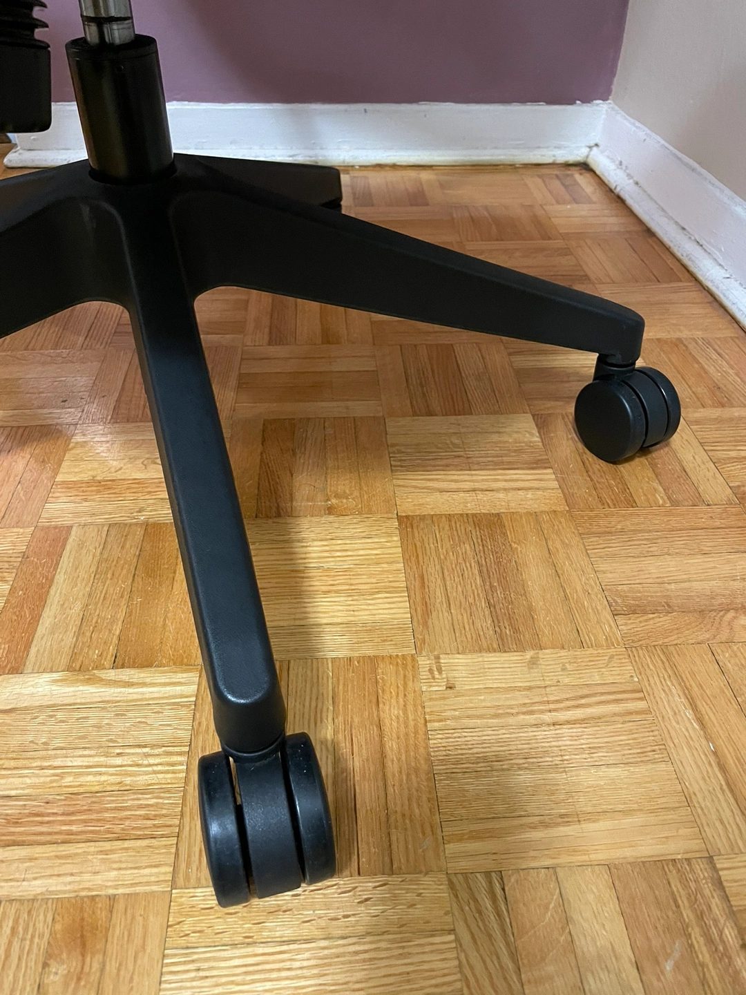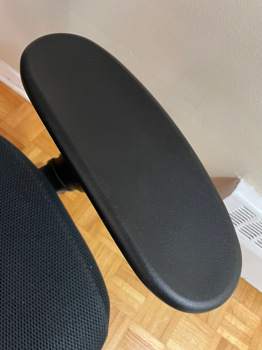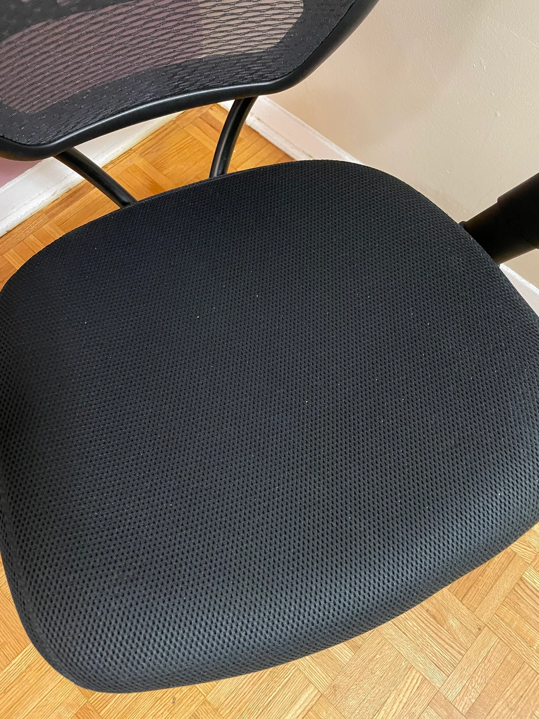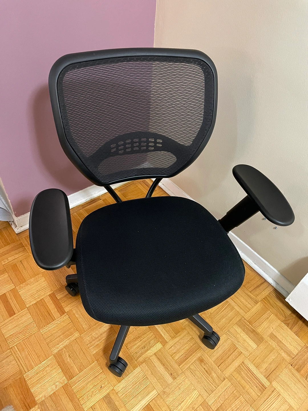 Office chair with black mesh back, seat and arms. The chair has a black, five-star base with black wheels.