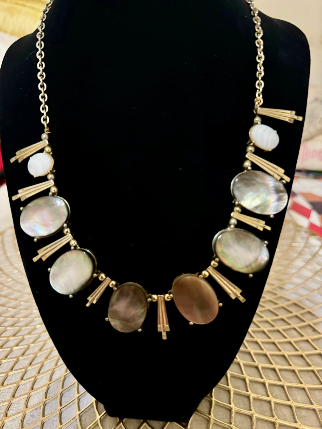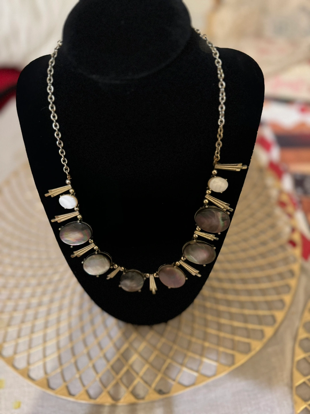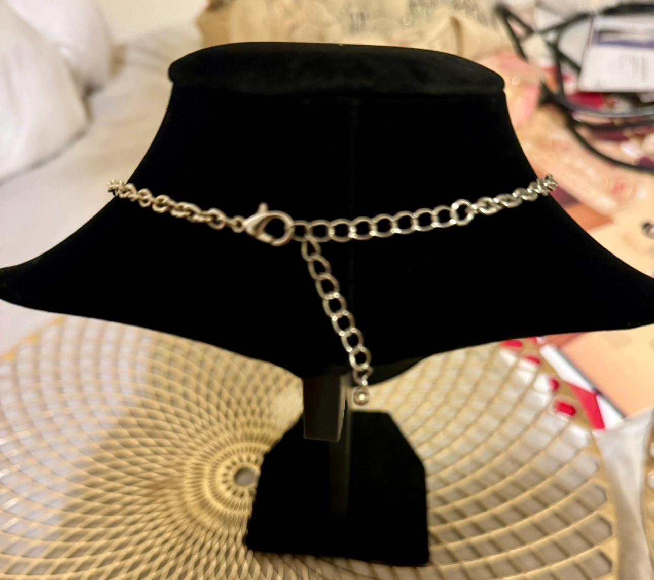 The chain features geometric designs throughout and the piece closes with a lobster claw clasp. The necklace is approximately 16 inches in length.