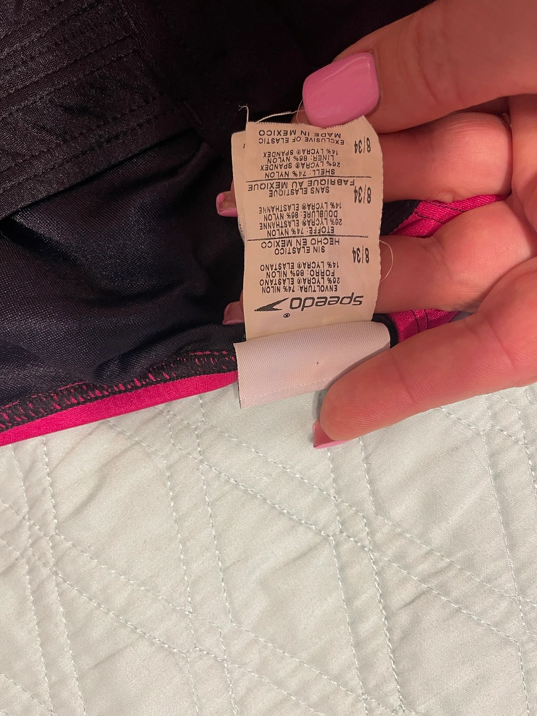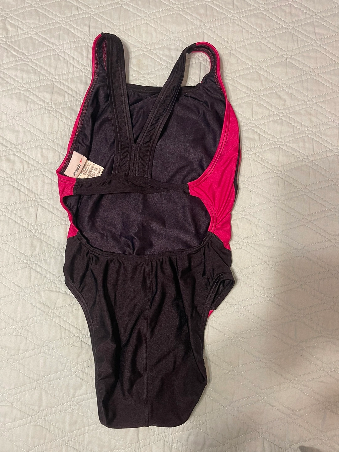 Black and pink Speedo one piece swimsuit with a criss-cross back. It didn't fit my granddaughter's size
