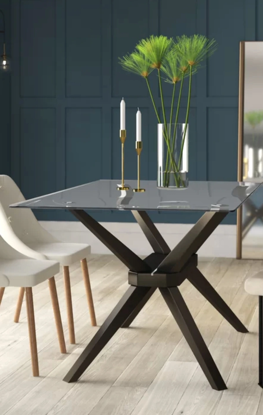 This is a glass dining table with a wooden base. It comes with a glass top and a base that is made of pieces of wood. The table is in good condition and has been used for an year. The wood has a few minor scratches.