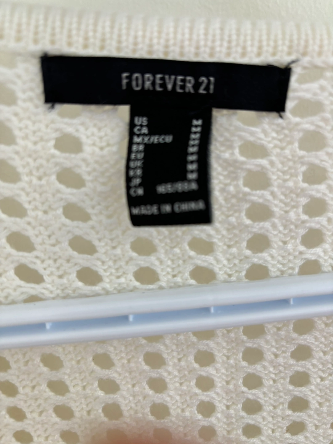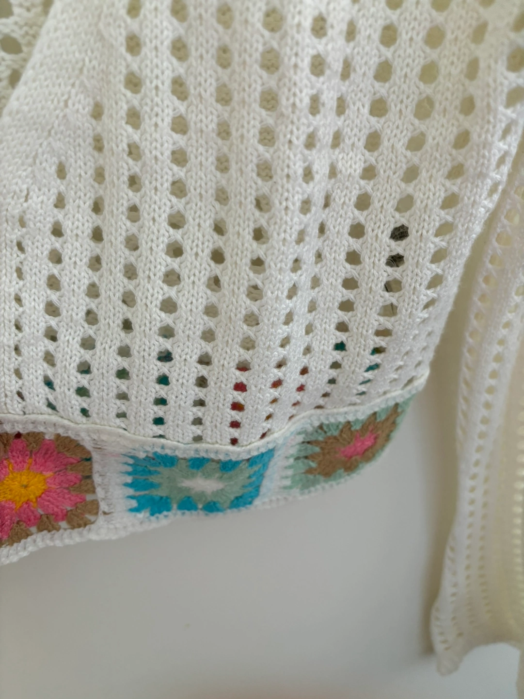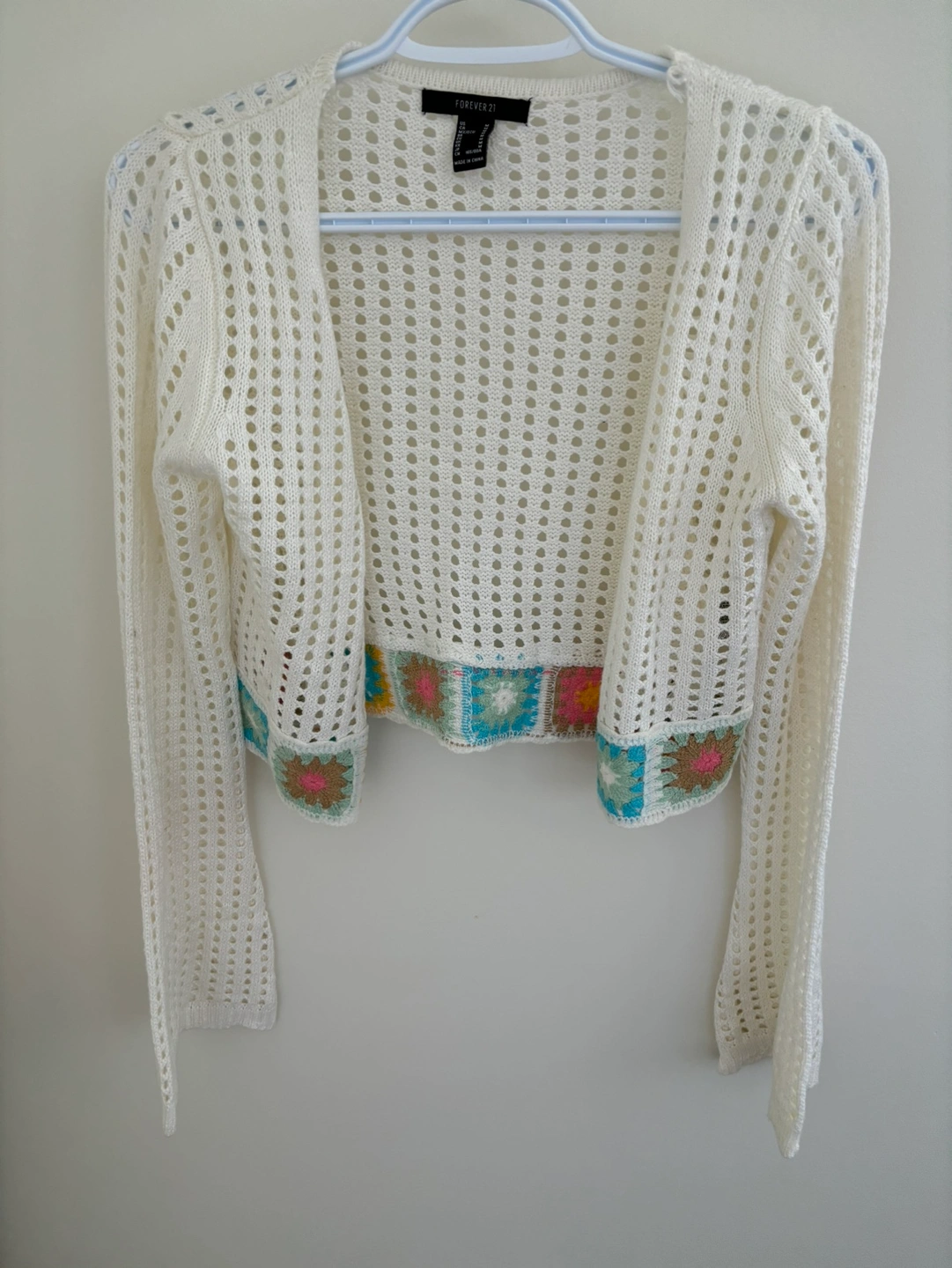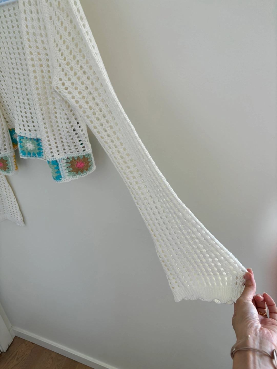 83Only wear once Can fit both S & M size White crochet cardigan with long flared sleeves and a crocheted trim at the bottom. Meet near Landsdown or Richmond Center