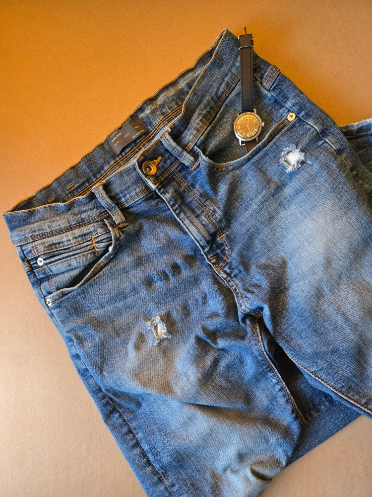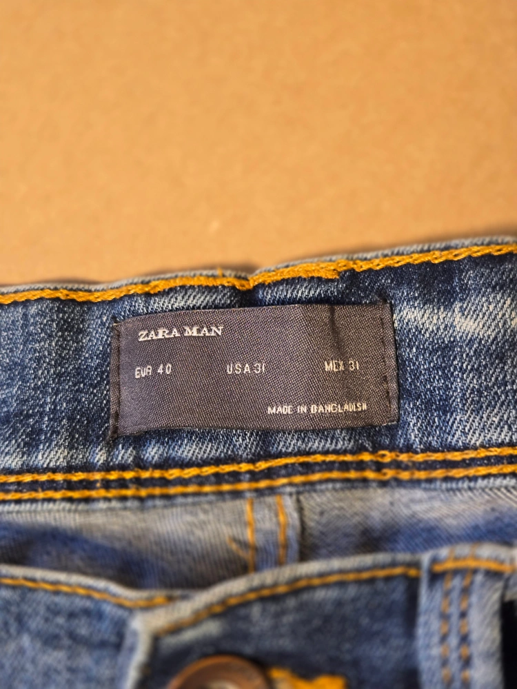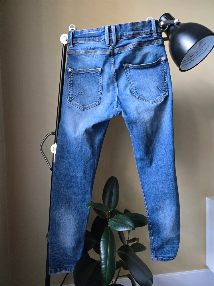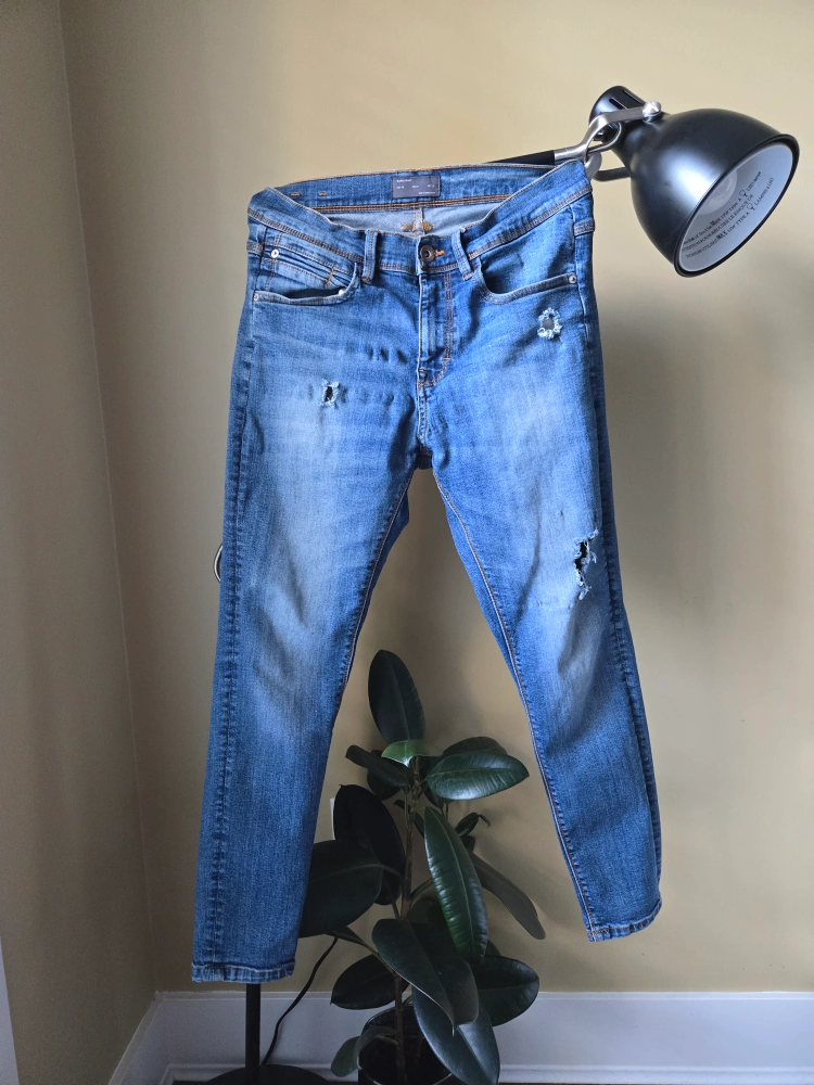 222Blue denim jeans with distressed detailing. Size 31.