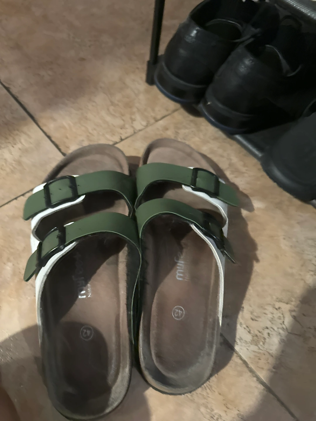 These are men's green and white sandals with two straps. They appear to be made of a synthetic material. They are size 42 (10)
