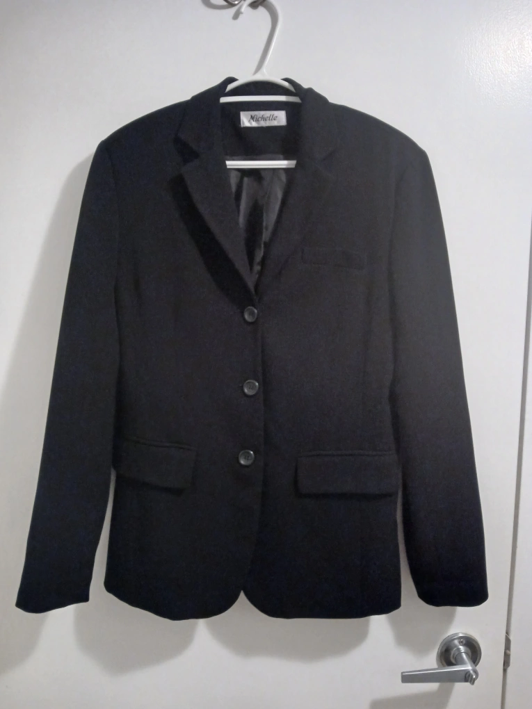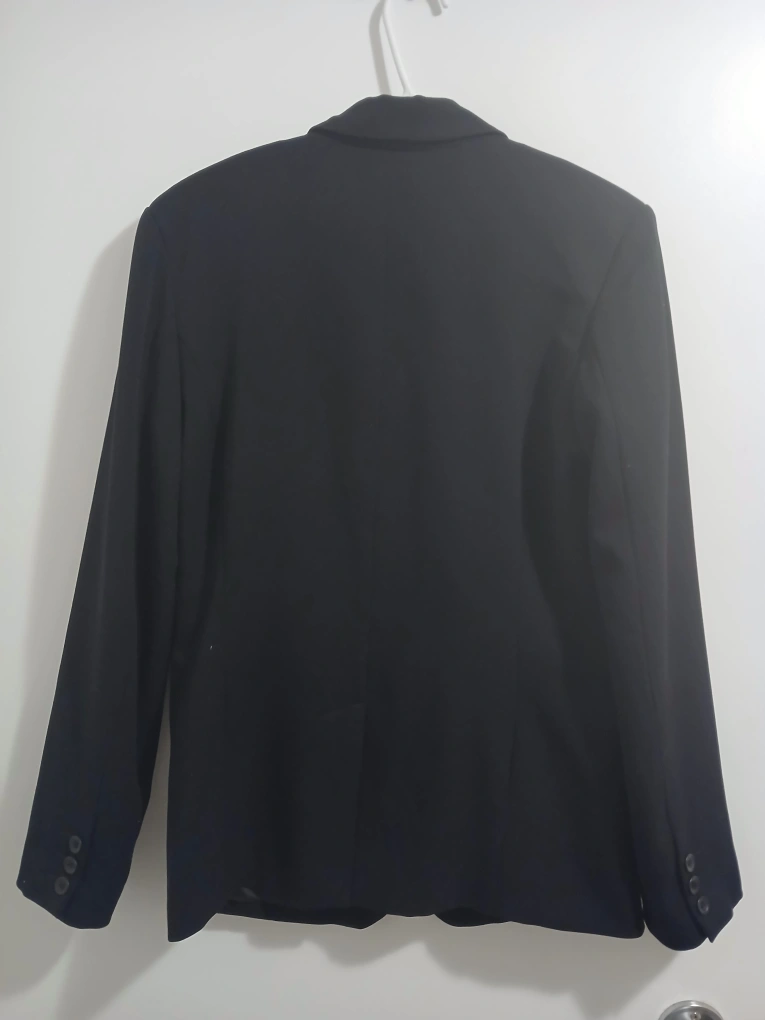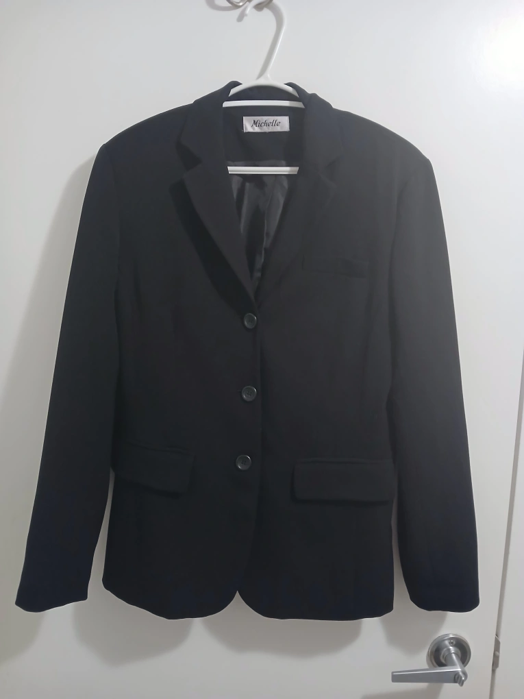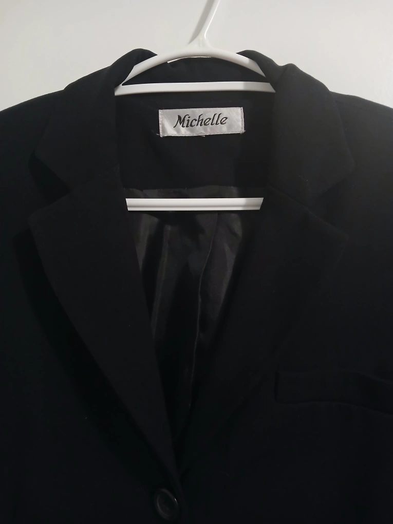Brand: Michelle Type: Formal blazer with 3 buttons Colour: Black Size: 8 Composition/material: 63% polyester, 43% rayon, 4% spandex Additional measurements: 71 cm length, 45 cm pit to pit Condition: Excellent Additional notes: Great for formal events, work, weddings, etc