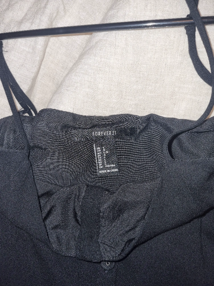 A black, button-up mini dress with spaghetti straps. The dress is made from a lightweight fabric and has a slightly fitted silhouette. Worn only few times, looks like new.